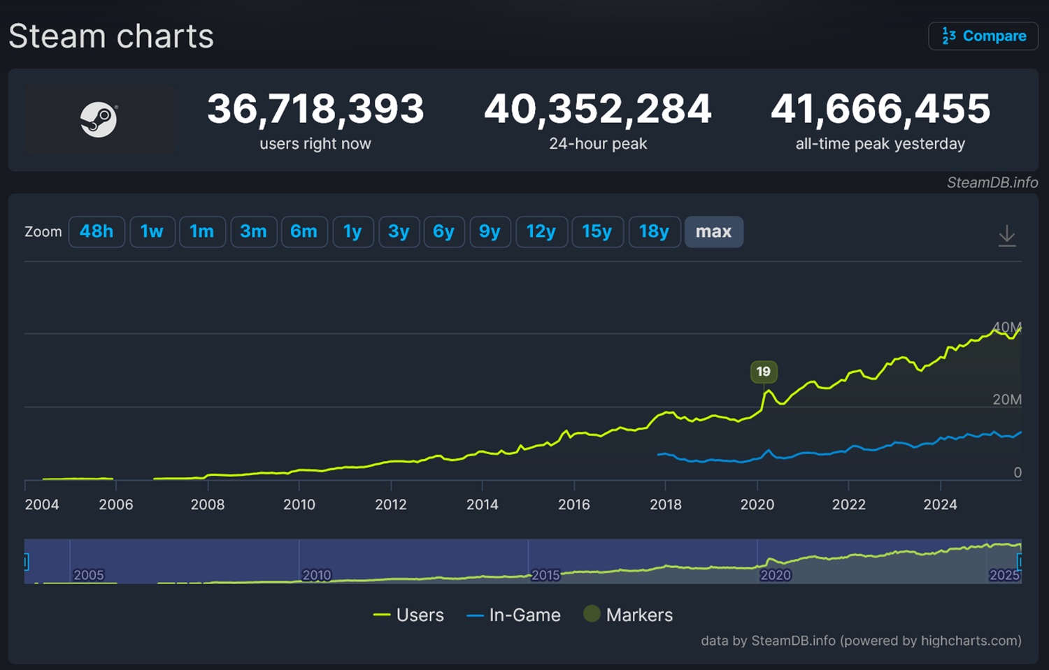 Steam est apparu en 2003 pour faciliter le téléchargement, la lecture et la mise à jour des titres de Valve. L'accueil de projets tiers quelques années plus tard a ouvert la voie à une expansion future. Selon SteamDB, le nombre de joueurs a atteint le million en 2008. La pandémie de Pandémie de COVID a permis à Steam de franchir le cap des 24 millions de joueurs en 2020, et celui des 40 millions en 2025.