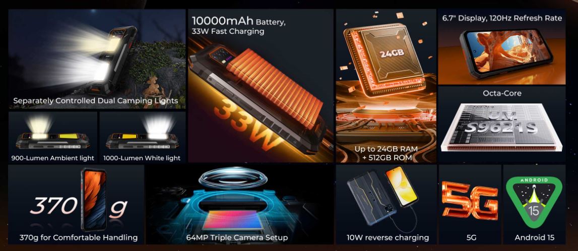 Quoi qu'il en soit, le smartphone d'Oukitel est équipé d'une batterie de 10 000mAh qui peut être rechargée jusqu'à 33 watts. Il prend également en charge la charge inversée de 10 W, de sorte qu'il peut être utilisé comme une banque d'alimentation. De plus, le WP58 Pro est équipé d'un SoC à huit cœurs et d'un support 5G, il n'est donc pas limité à la 4G LTE comme d'autres smartphones robustes bon marché. Les autres spécifications comprennent 8 Go de RAM, tandis que le stockage de masse de 512 Go est également de taille raisonnable. Le téléphone fonctionne sous Android 15 et les utilisateurs peuvent étendre le stockage via microSD en sacrifiant l'un des deux emplacements de carte SIM.