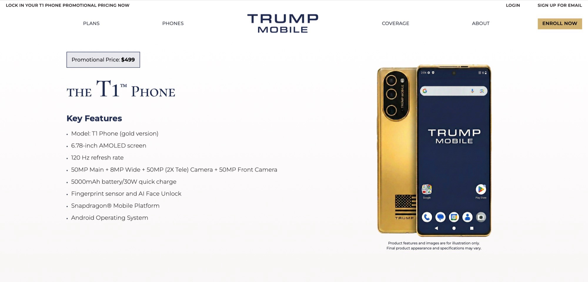 Contrairement à ce qui avait été annoncé, le Trump T1 Phone n'est pas fabriqué aux États-Unis et le design a depuis été remplacé par une version dorée du Samsung Galaxy S26 Ultra(1 299 $ sur Amazon) ou de l'iPhone 16 Pro, une date de livraison n'a toujours pas été confirmée près d'un an plus tard, et même les spécifications ont changé à plusieurs reprises. En février, Trump Mobile a finalement révélé le design supposé final. Aujourd'hui, une version personnalisée de ce design est présentée sur la page officielle du produit ainsi que des spécifications qui ont encore été modifiées