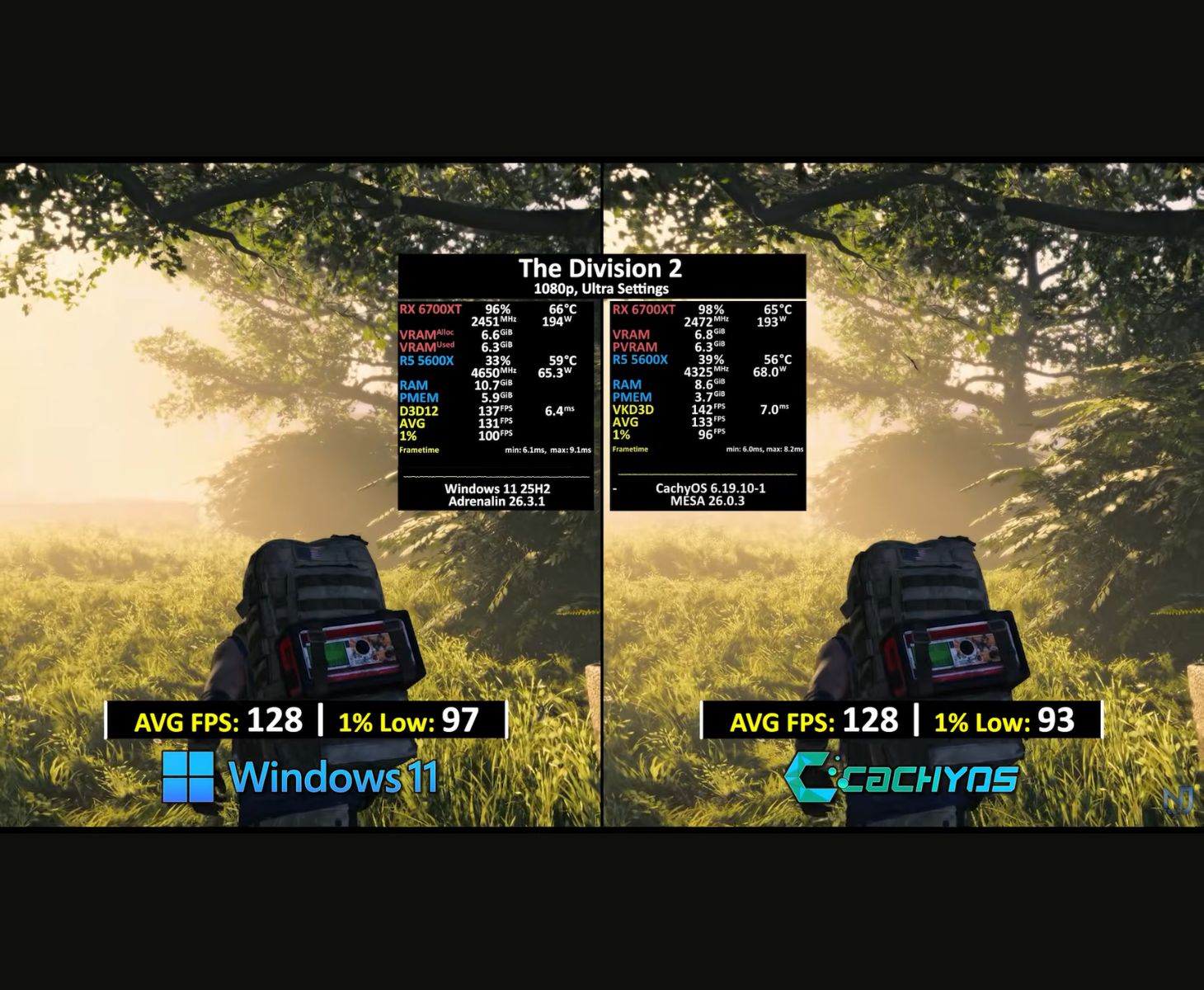 Cependant, Windows 11 a comblé l'écart dans des jeux comme The First Descendant à des paramètres 1080p Ultra avec FSR 3 Native, où il a fait tourner le jeu à 63 FPS, alors que CachyOS n'a réussi qu'à 54 FPS. Avec The Division 2 à 1080p Ultra, Windows 11 et CachyOS ont tous deux atteint 128 FPS, Windows 11 offrant de meilleurs 1% de basses à 97 FPS contre 93 FPS pour CachyOS.