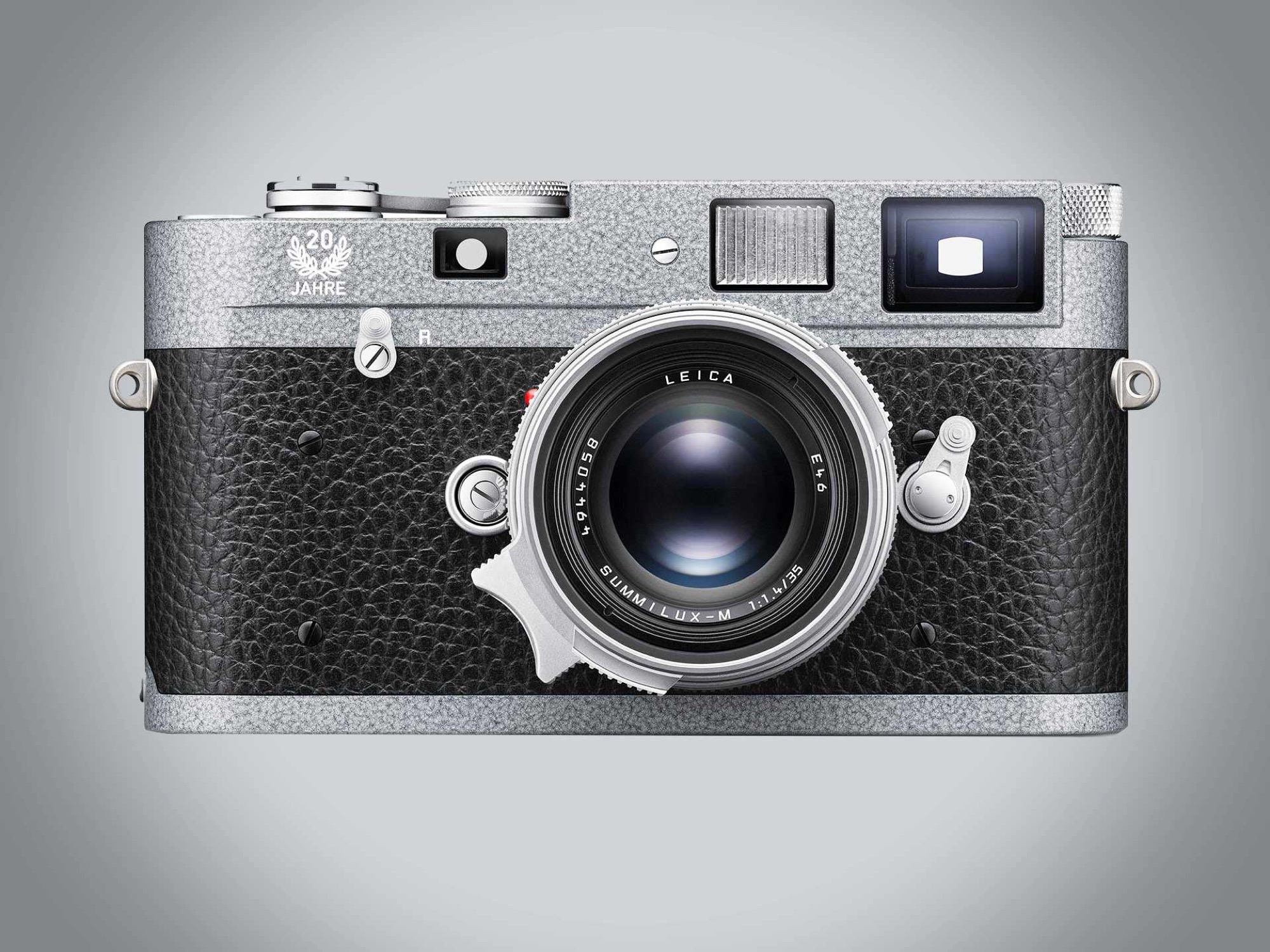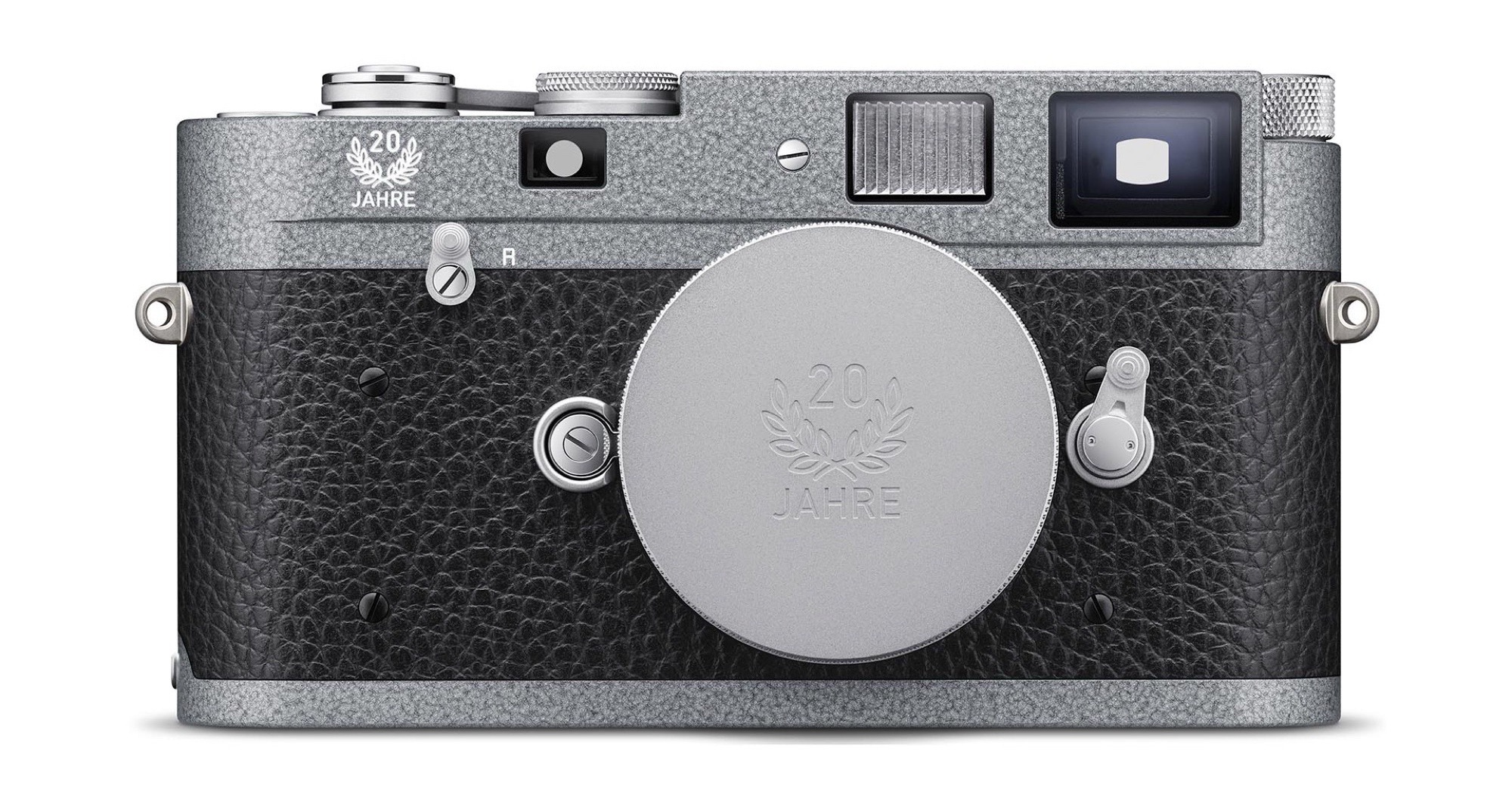 Cette édition limitée combine un faux cuir noir avec une plaque supérieure et une plaque inférieure qui sont finies avec une peinture grise "hammertone", qui est censée être particulièrement robuste. Le nom vient du fait que la surface de la peinture est censée donner l'impression que le métal a été forgé à la main avec un marteau. Le lettrage "20 Jahre" fait référence à l'anniversaire. Techniquement, l'édition limitée correspond au Leica M-A normal