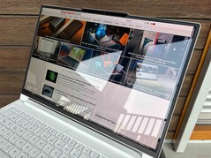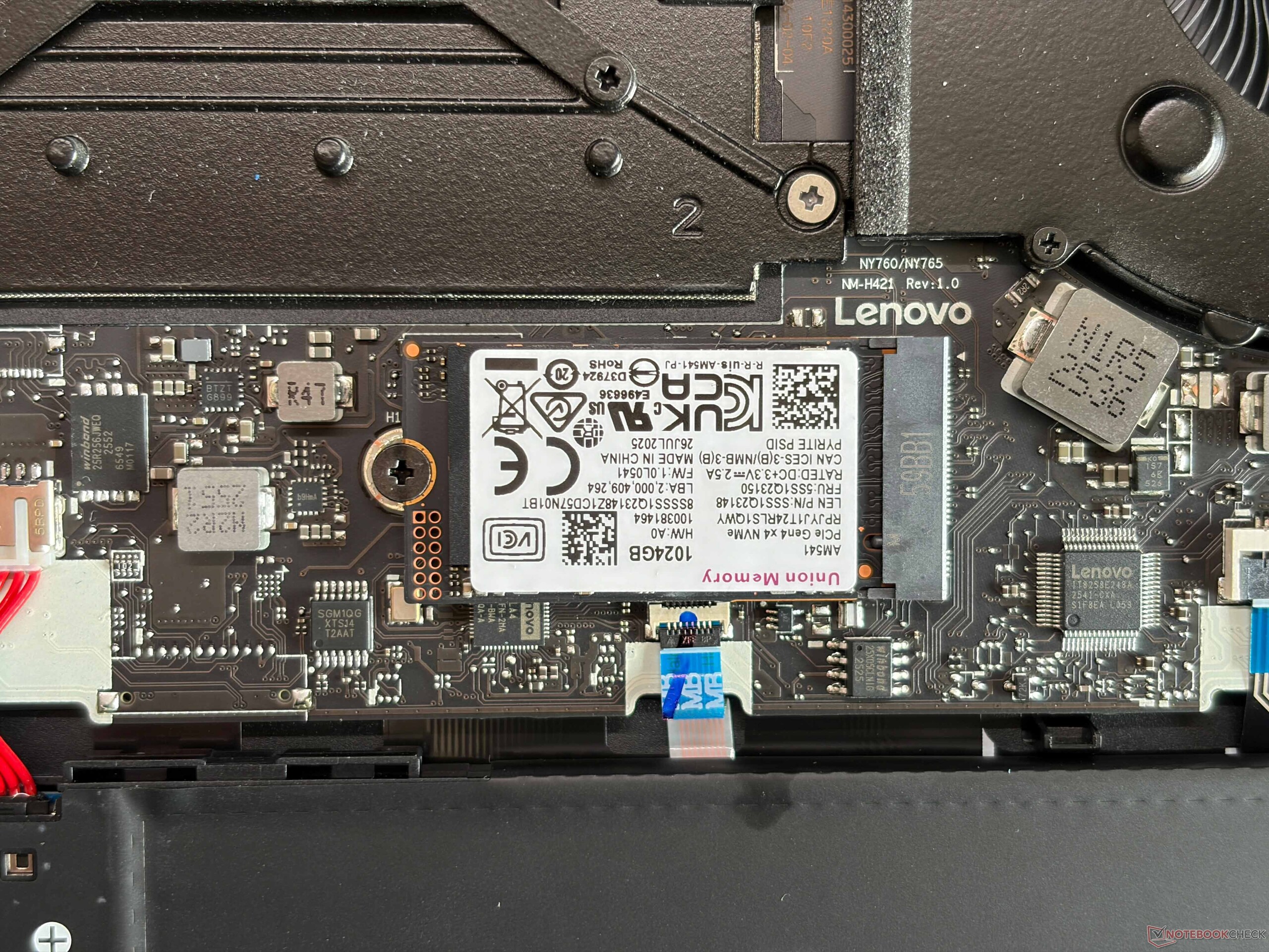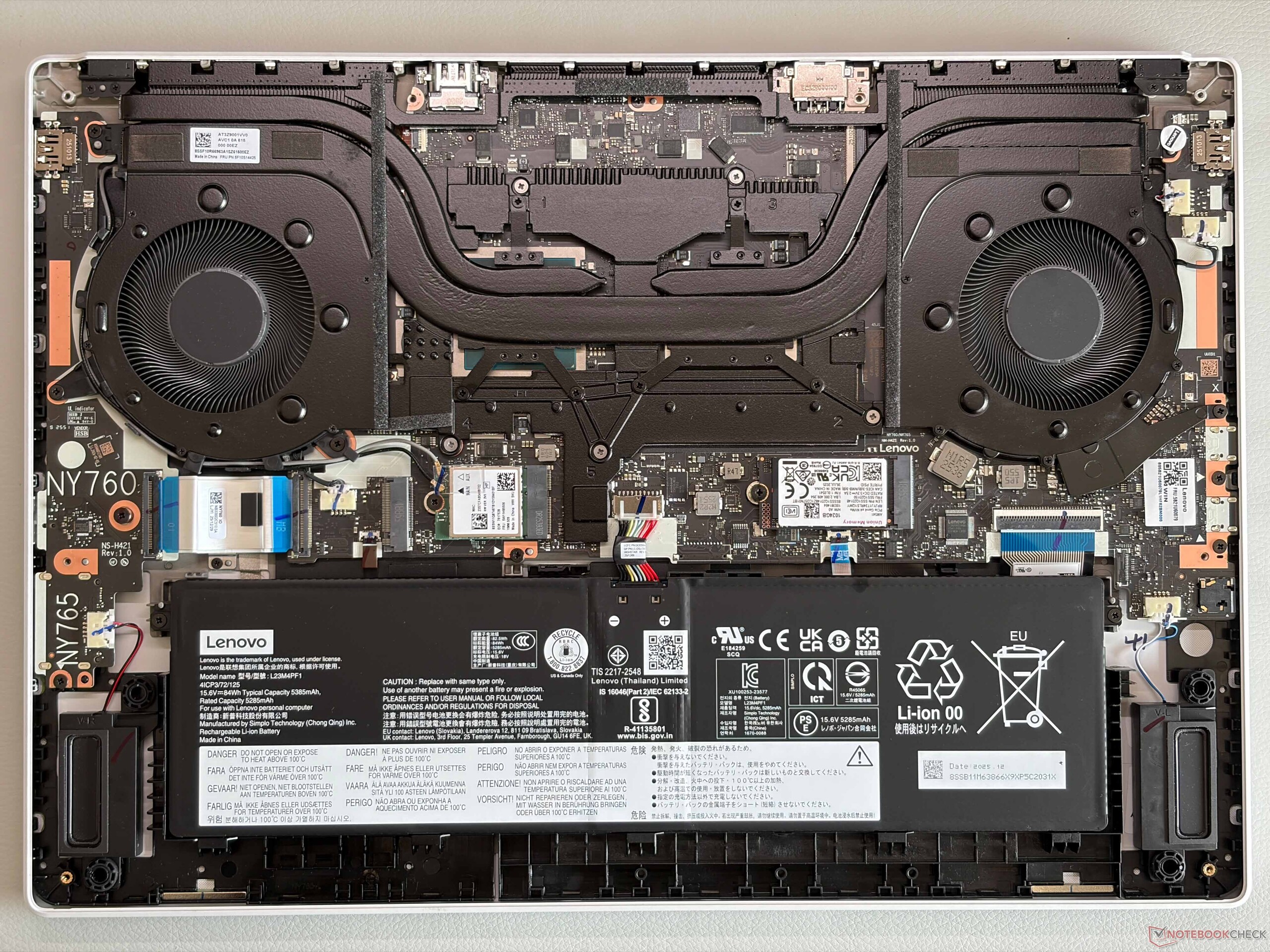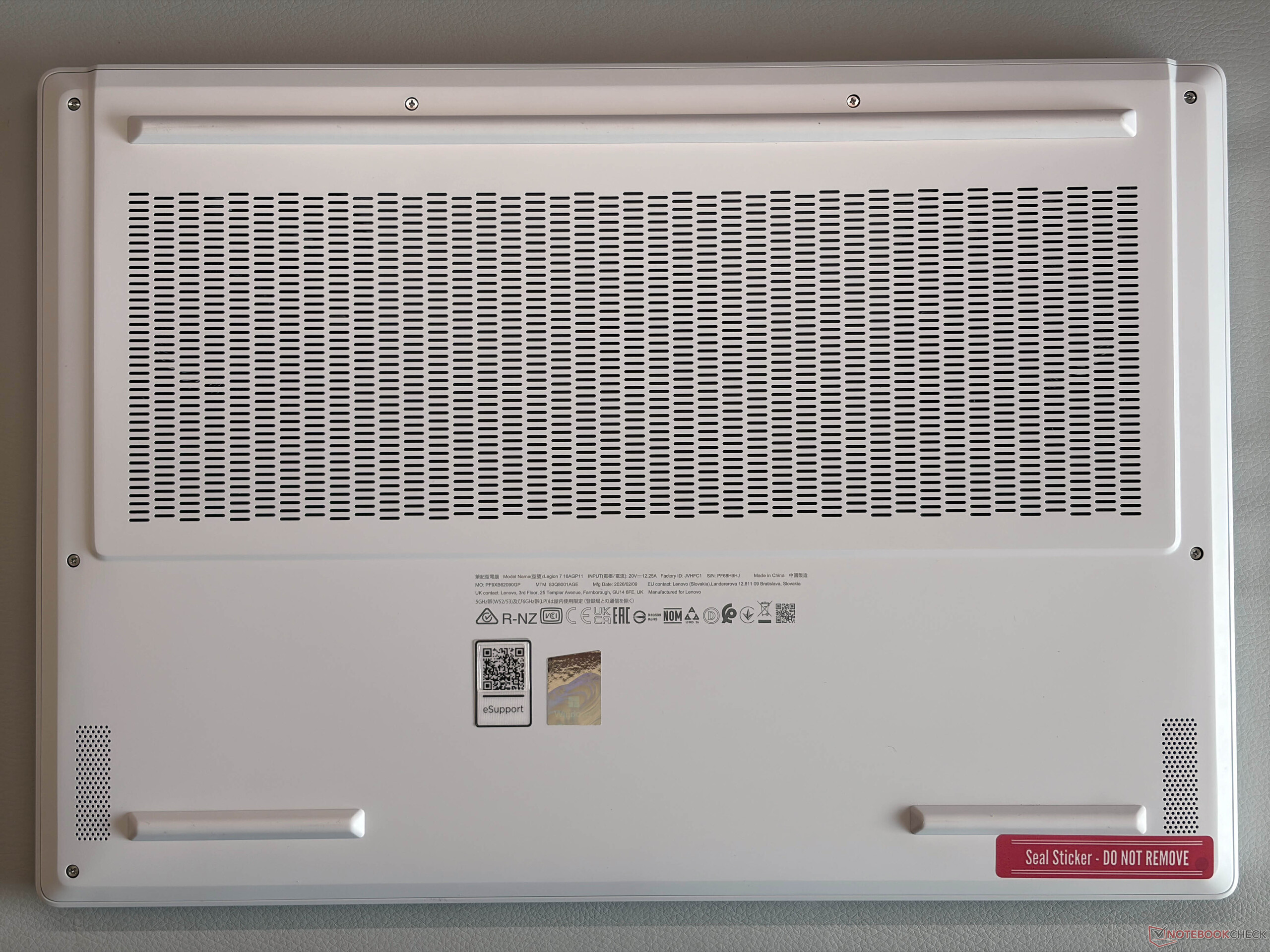 Notre appareil d'essai blanc est très joli et les surfaces en aluminium n'attirent pas vraiment les empreintes digitales ou la saleté, ce qui le rend très facile à nettoyer. Les éléments d'éclairage sont réduits au minimum. Le poids réduit n'affecte pas la stabilité et le nouveau modèle AMD est tout aussi robuste qu'auparavant. Les charnières (angle d'ouverture maximal de 180 degrés) sont également bien réglées et réduisent les rebonds au minimum. Les options de maintenance se limitent au SSD M.2-2242, à un emplacement M.2-2280 libre, au module Wi-Fi ainsi qu'au nettoyage des ventilateurs, tandis que la RAM est soudée.