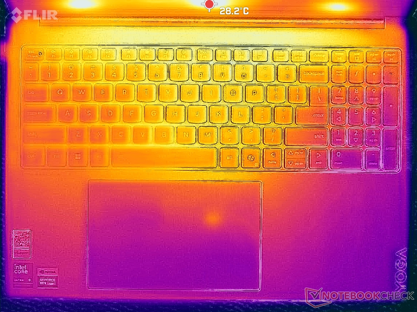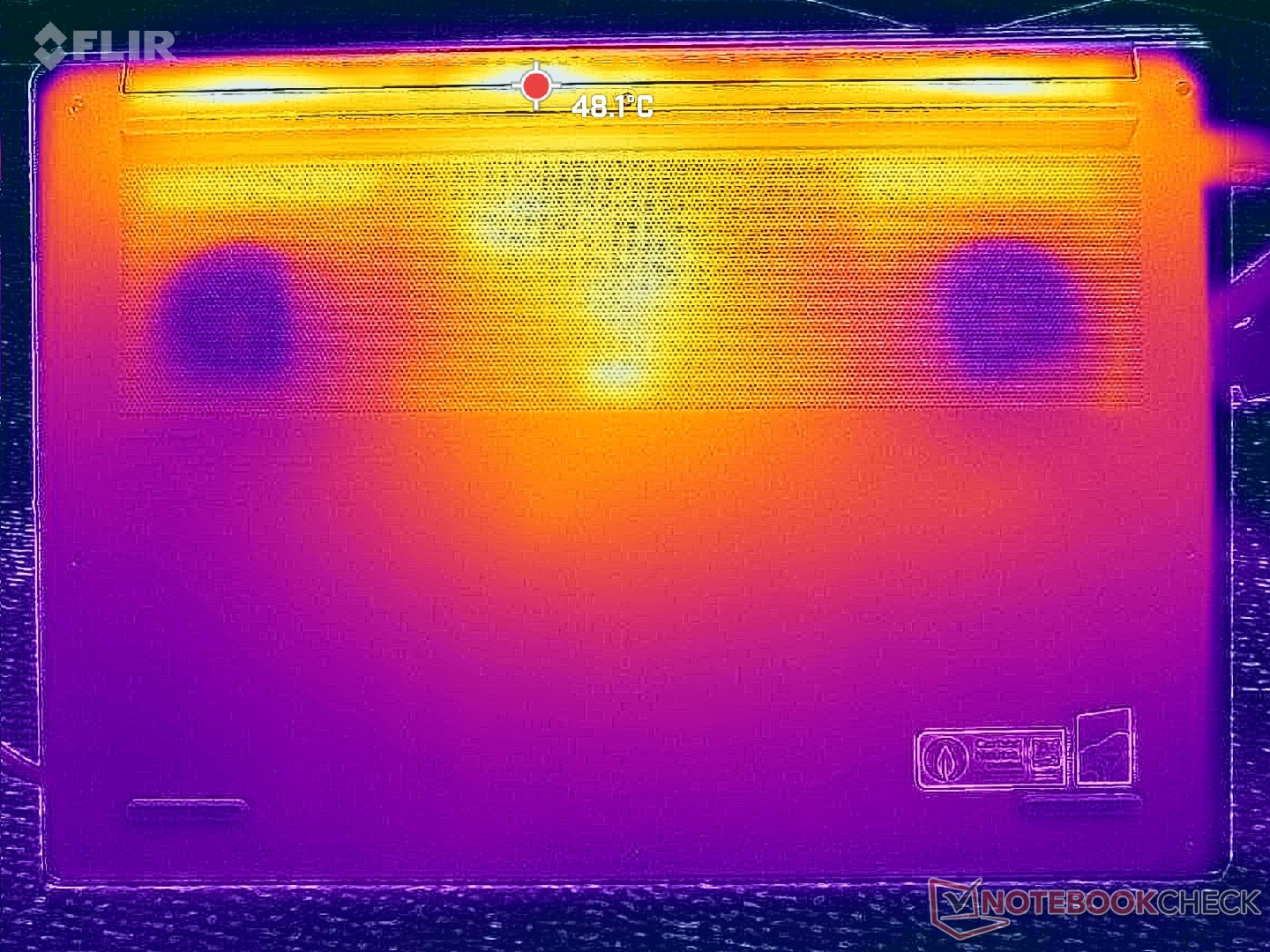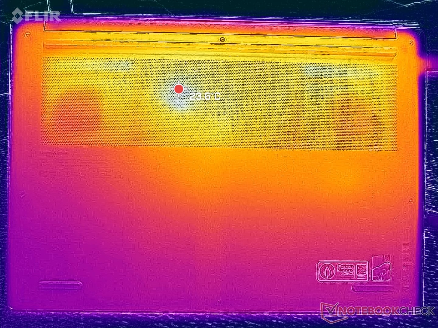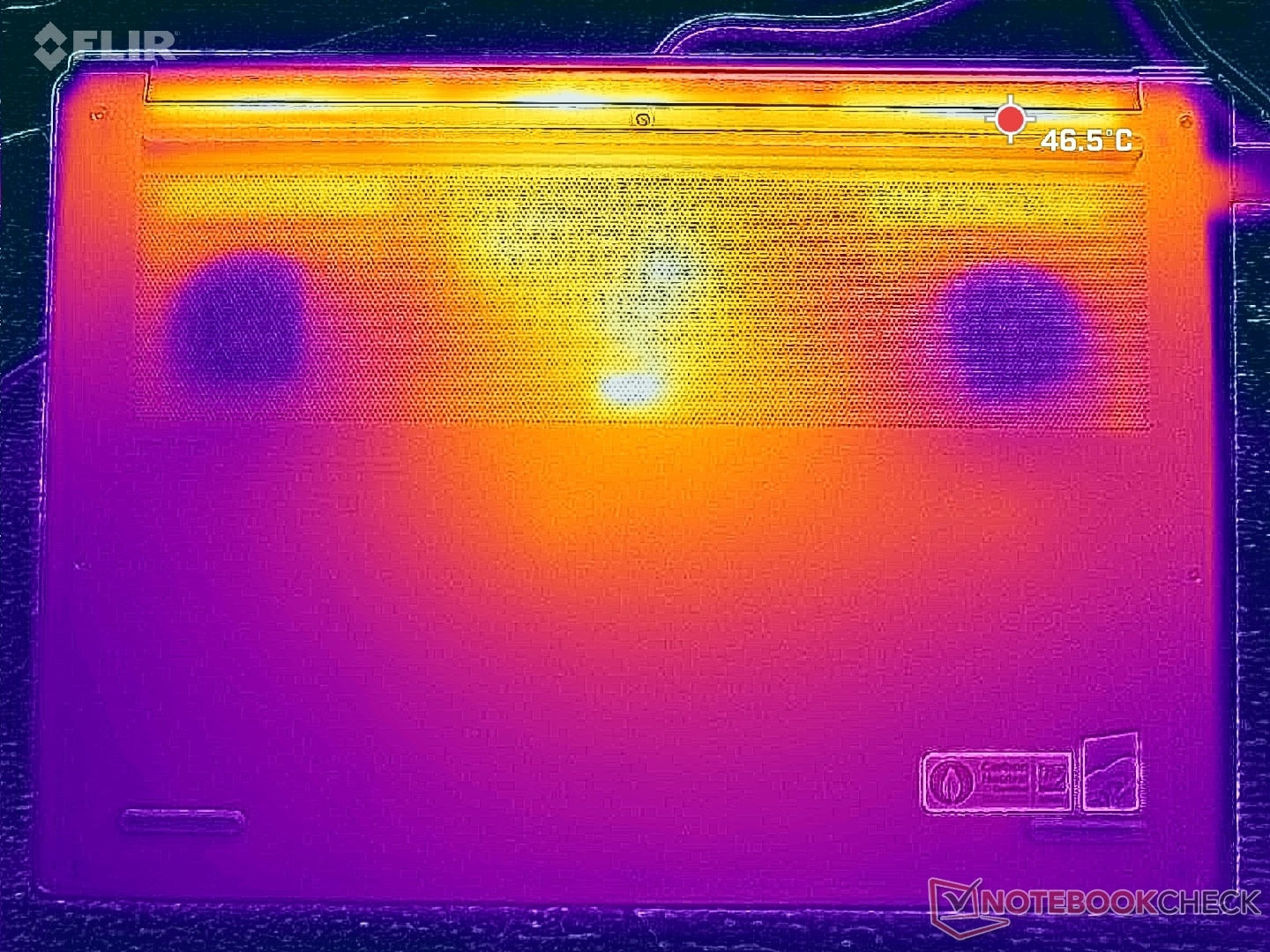 Les températures de surface lors de l'exécution de charges exigeantes sont sensiblement plus fraîches que ce que nous avons enregistré sur la configuration RTX 5070. Les points chauds au ralenti sur Cyberpunk 2077 atteignent un peu plus de 35 C et 42 C sur le clavier et le capot inférieur, respectivement, contre 42 C et 46 C sur l'unité RTX 5070 plus rapide.