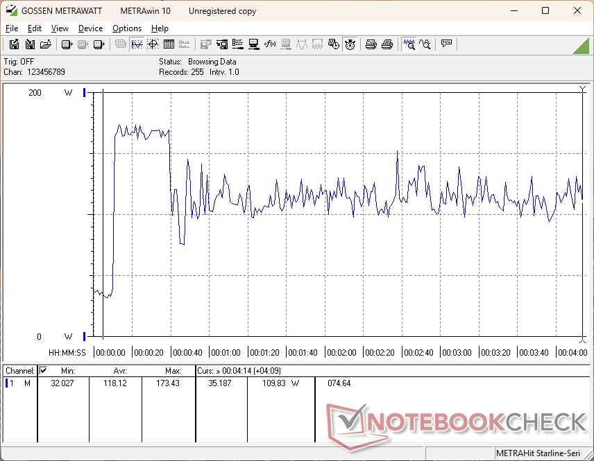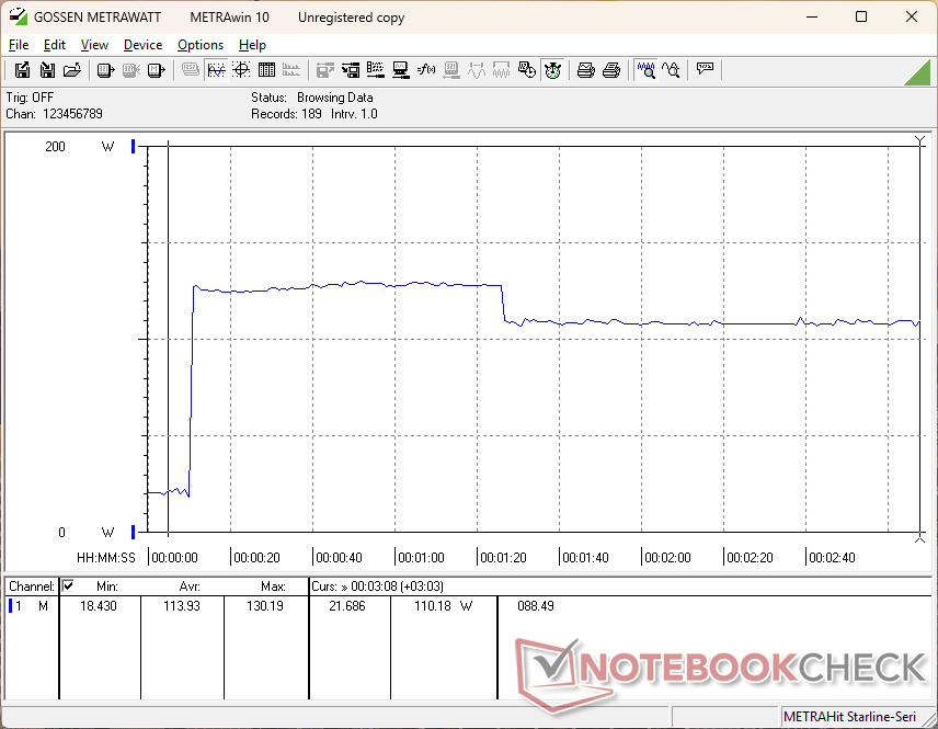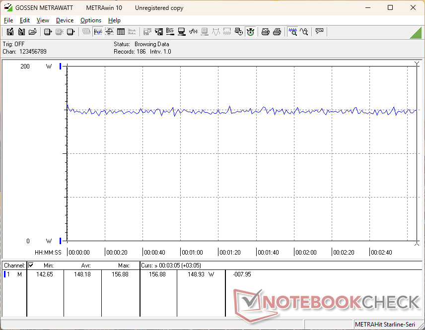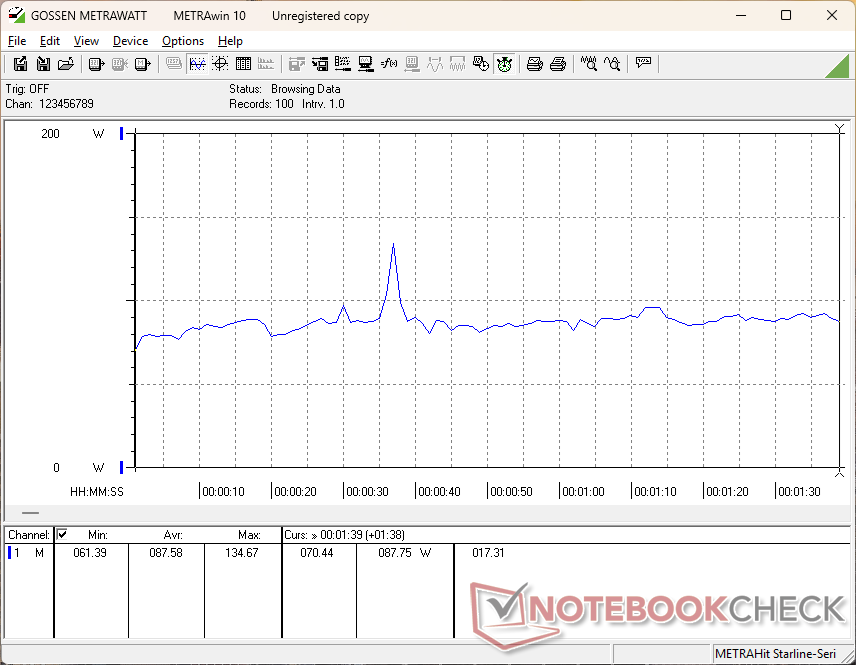 La consommation peut être aussi basse que 7 W en mode iGPU avec l'écran réglé sur la luminosité minimale ou plus de 22 W en mode dGPU avec la luminosité maximale. Dans les jeux, cependant, le système ne consomme que quelques watts de moins que les options RTX 5060 ou 5070, beaucoup plus rapides. La mise à niveau vers la configuration RTX 5060, par exemple, ne consommerait que 6 % de plus pour des performances de jeu de 20 à 30 % plus rapides.
