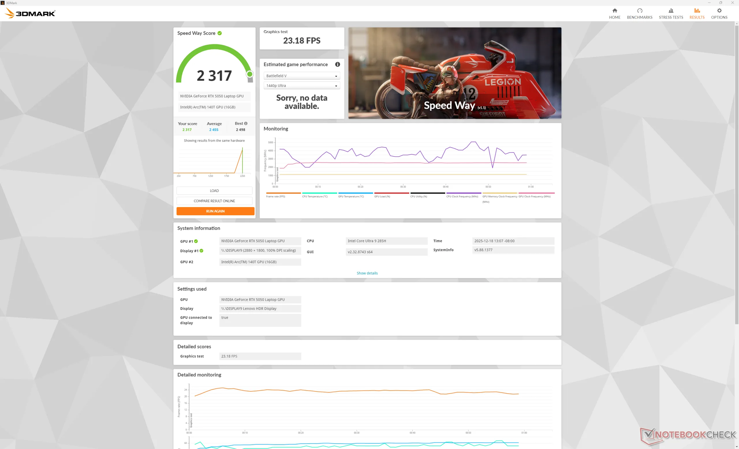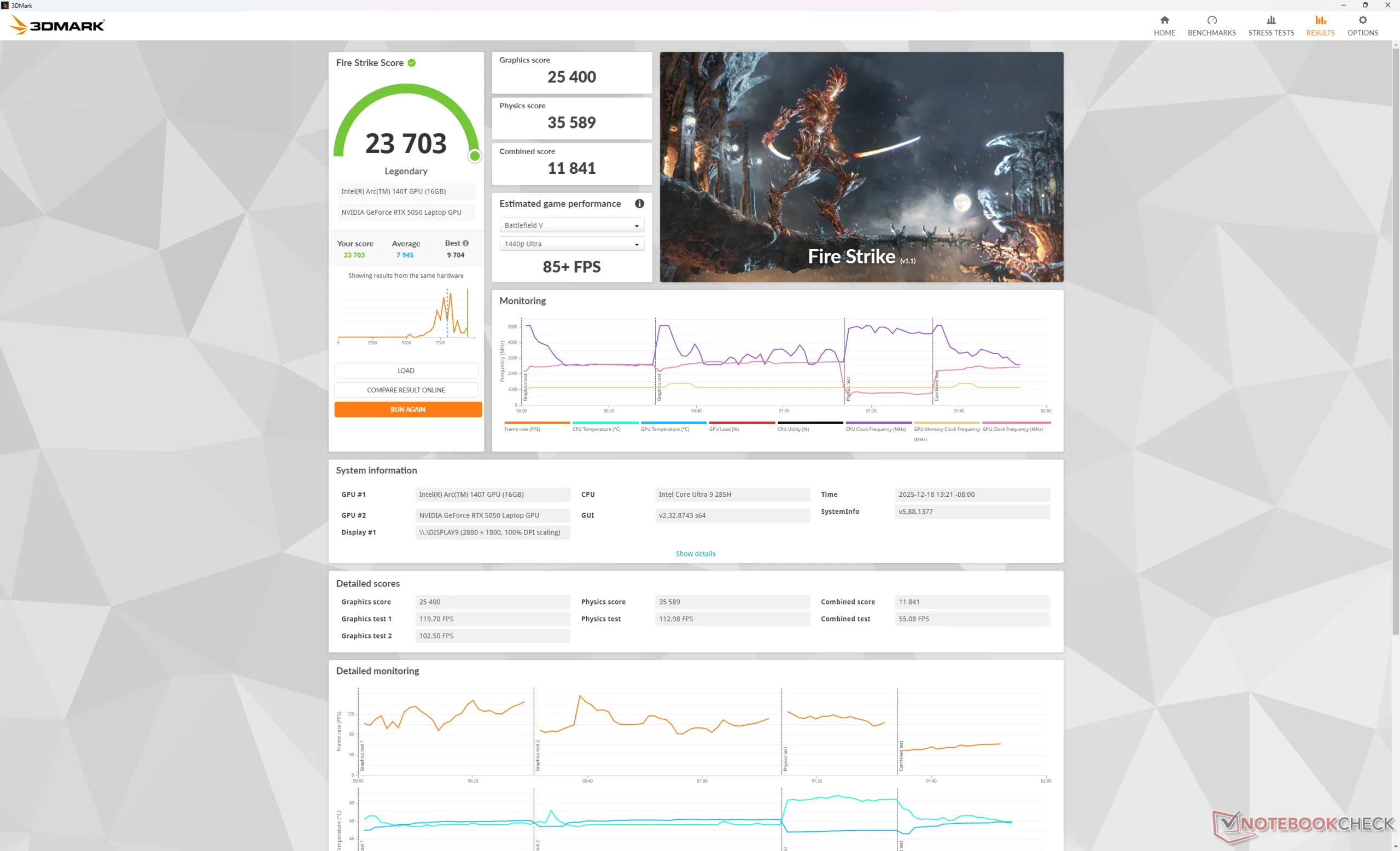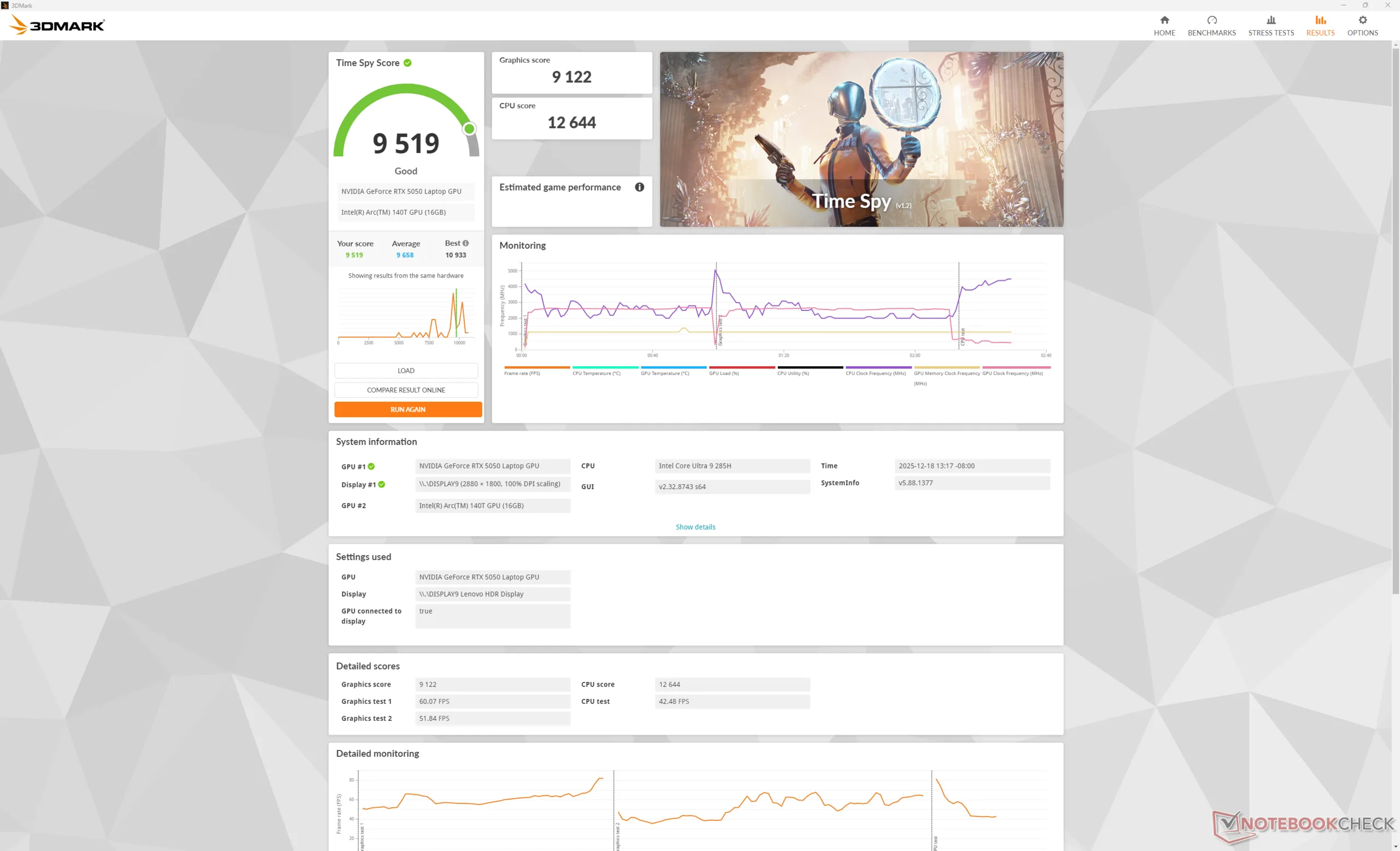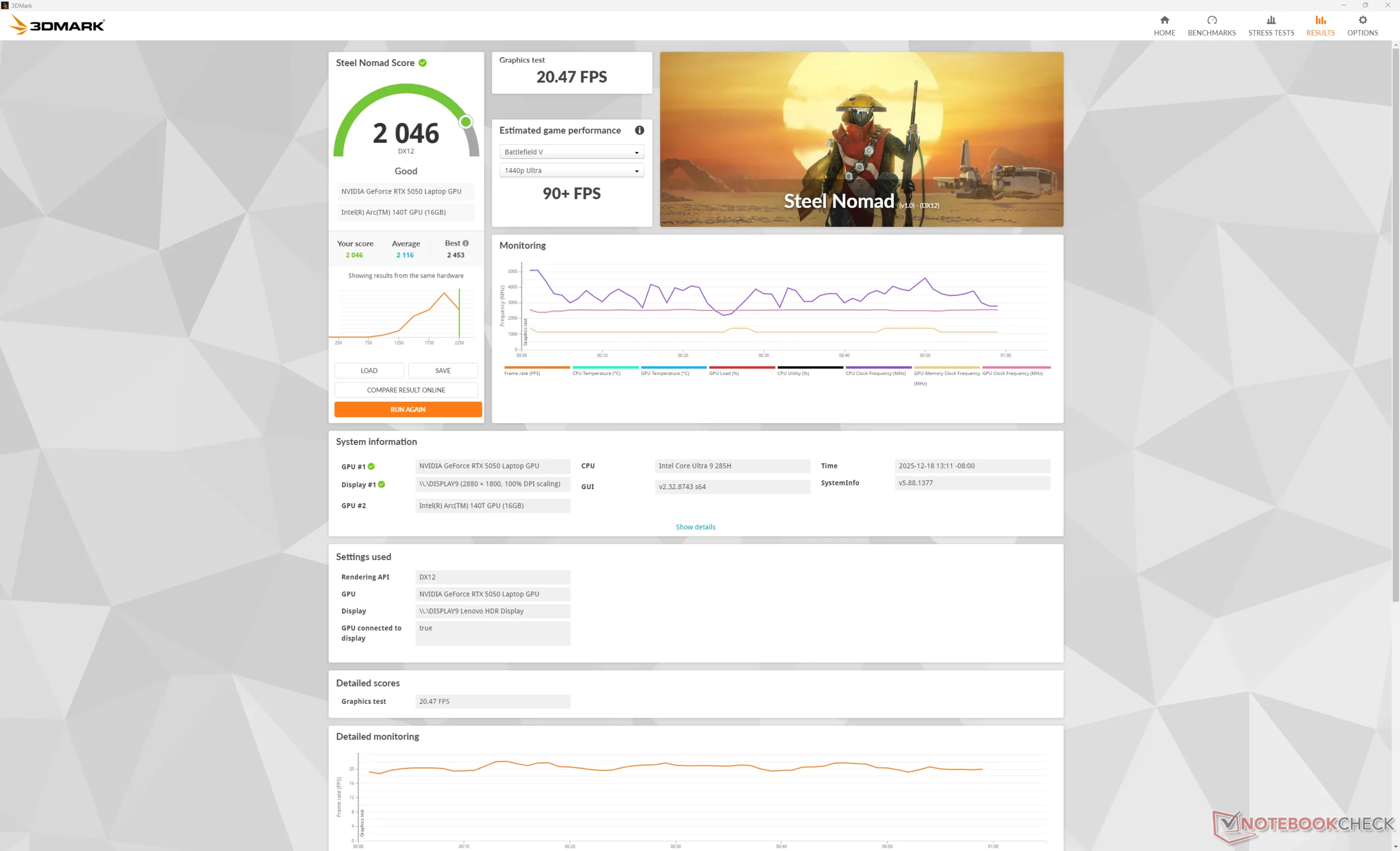 Pire encore, opter pour la configuration RTX 5050 ne signifie pas nécessairement une plus grande autonomie de la batterie ou des ventilateurs plus silencieux lorsque vous jouez ou exécutez des charges lourdes, en dépit de ses performances plus lentes. Le Core Ultra 9 285H n'offre même pas beaucoup d'avantages par rapport au Core Ultra 7 255H moins cher, mais les SKUs avec ce dernier CPU sont malheureusement plus difficiles à trouver aux Etats-Unis. Les températures de fonctionnement peuvent être plus basses, mais ce léger avantage n'est rien comparé à la longue liste d'inconvénients de l'option RTX 5060, plus intéressante.
