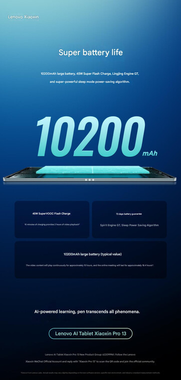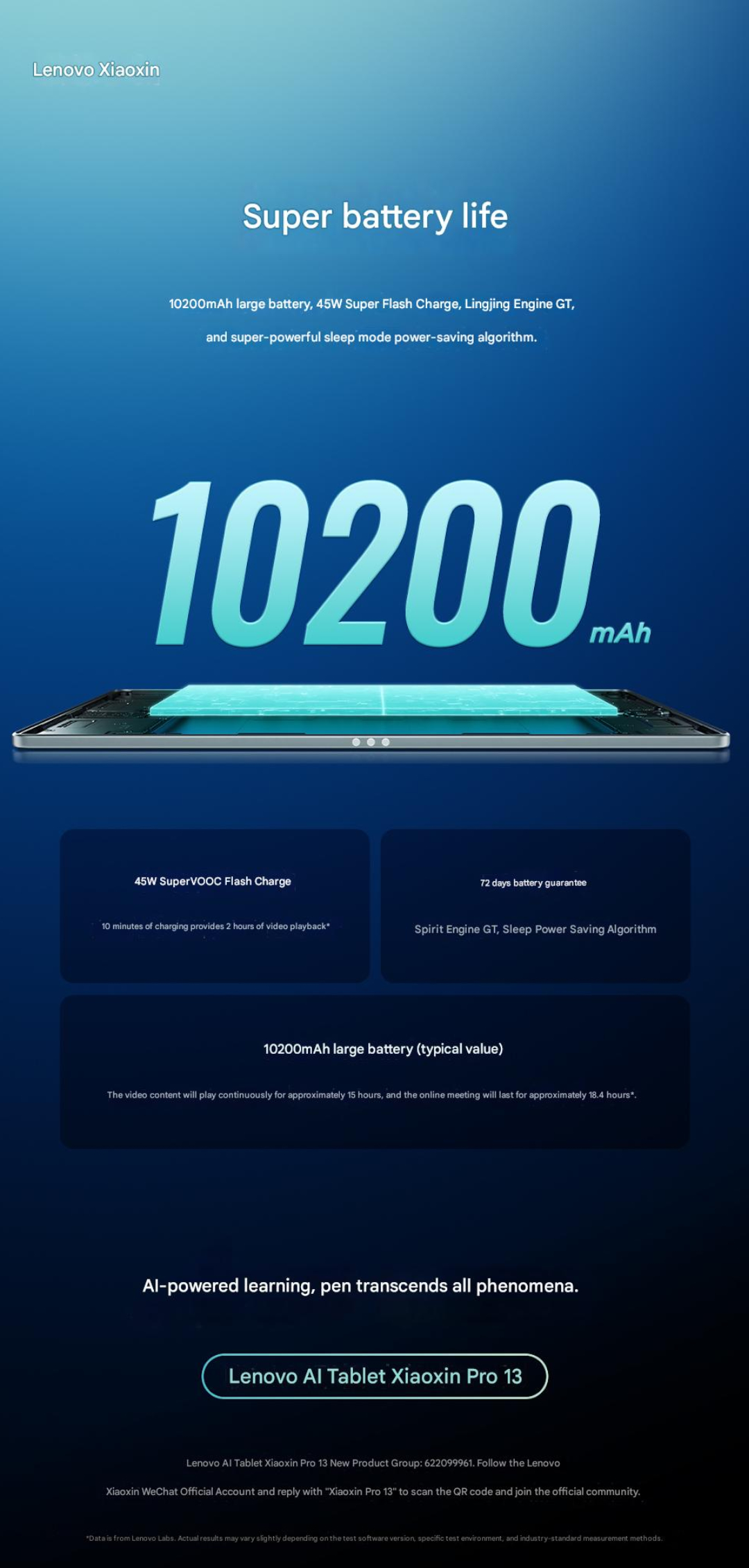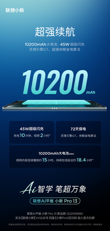 Lenovo a confirmé que la Xiaoxin Pro 13 sera équipée d'une batterie de 10 200 mAh. Il s'agit de la même capacité de batterie que celle de la tablette Xiaoxin Pro 12.5 de l'année dernière Xiaoxin Tablet 12.1cette batterie de 10 200 mAh surpassera l'équivalent en carbone silicium de 8 860 mAh que Lenovo utilise dans la Xiaoxin Tablet Pro GT Xiaoxin Tablet Pro GT. Cette batterie devrait permettre à la Xiaoxin Pro 13 de tenir 15 heures de lecture vidéo en continu et environ deux jours de réunions en ligne consécutives.