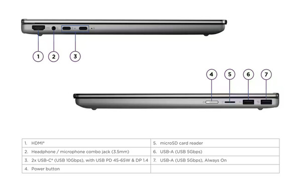 En bref, le 15IPH11 partage la plupart de ses caractéristiques matérielles avec le 15AGP11 que Lenovo a récemment mis sur le marché. Cependant, quelques différences notables séparent les deux ordinateurs portables de 15,3 pouces. Tout d'abord, les modèles Intel Panther Lake disposent d'un port HDMI 1.4b relativement obsolète plutôt que l'équivalent HDMI 2.1 plus récent du 15AGP11. Par conséquent, le 15IPH11 ne peut émettre vers un moniteur externe qu'à une fréquence maximale de 4K/30 Hz via son port HDMI.