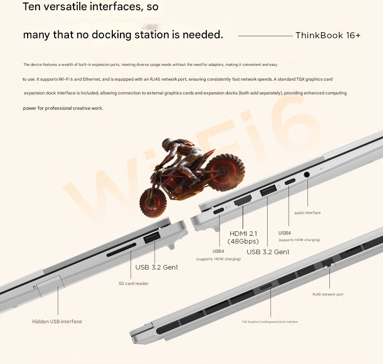 Outre l'écran, les autres caractéristiques des ThinkBook 16 Plus et 14 Plus 2026 alimentés par AMD sont identiques. Ils prennent tous deux en charge jusqu'à 8 To de stockage PCIe 4.0, et Lenovo a associé l'APU AMD à 32 Go de RAM LPDDR5x fonctionnant à 7500MT/s. En plus du port TGX, les ordinateurs portables disposent des ports suivants :