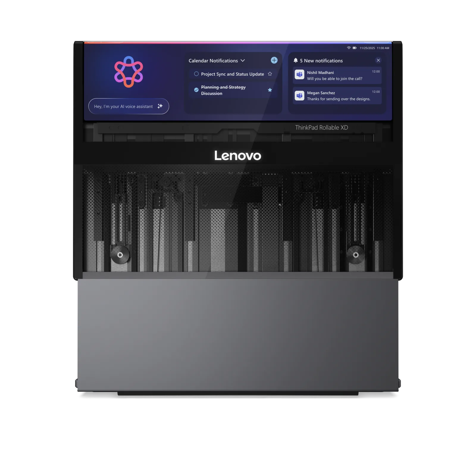 D'après les documents de présentation, le ThinkPad Rollable XD Concept utilise un écran enroulable qui se déploie verticalement, ce qui permet de changer la taille de l'écran en fonction de la tâche à accomplir. Cette approche devrait améliorer les flux de travail qui bénéficient généralement d'un espace vertical supplémentaire, comme l'édition de documents, le codage ou le multitâche, sans pour autant augmenter l'encombrement de l'ordinateur portable lorsqu'il est fermé.