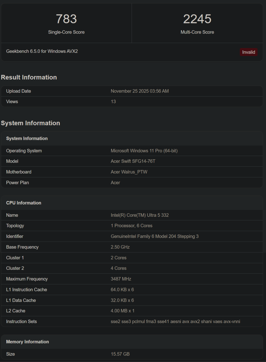 Passons au Core Ultra 5 322 d'entrée de gamme, dont le score de sur Geekbench est signalé comme invalide. Mais le listing nous éclaire sur ses spécifications, à savoir 2 cœurs P, 2 cœurs E et 2 cœurs LPE. Cet ordinateur portable appartient à la gamme Acer Swift et dispose de 16 Go de RAM, d'un GPU RTX 5060 et d'un adaptateur graphique Intel non spécifié.