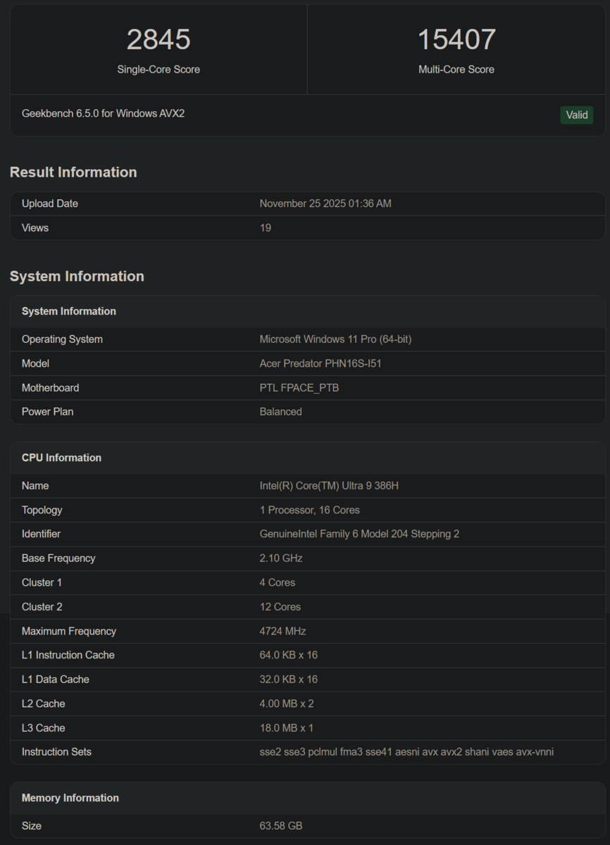 Les cœurs P atteignent 4,7 GHz, soit un peu moins que la vitesse d'horloge annoncée vitesse d'horloge annoncée de 4,9 GHz. Pour le GPU, il utilise un SKU Intel Graphics non spécifié (et non l'Arc B390) en combinaison avec un processeur GeForce RTX 5060 de Nvidia. Enfin, l'ordinateur portable dispose de 64 Go de RAM et semble être une variante de l'Acer Predator à venir.