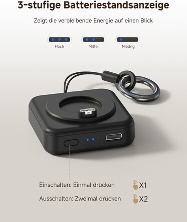 Le chargeur est conçu pour être pratique à porter sur un porte-clés ou dans un sac à dos, et pour charger une smartwatch lors de voyages plus courts sans avoir à débrancher le chargeur à la maison ou à chercher un connecteur USB approprié lors des déplacements. Une fois la batterie de 1 200 mAh épuisée, elle peut être rechargée via un câble USB-C. Le chargeur mesure 5 x 5 x 2 centimètres et pèse 44 grammes.