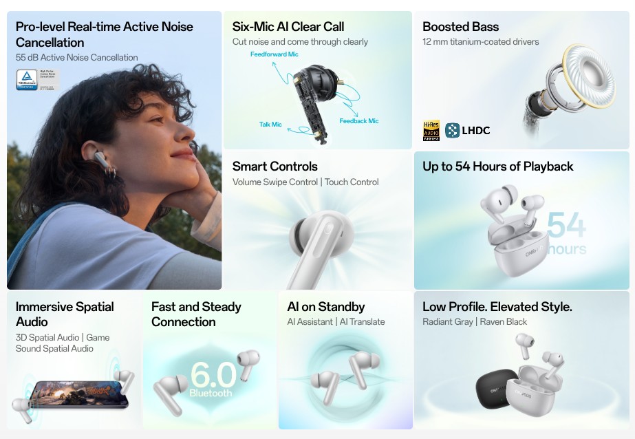 Chaque écouteur est doté de trois microphones qui fonctionnent avec un algorithme d'intelligence artificielle exclusif pour détecter et réduire le bruit du vent et de la circulation pendant les appels. Autre nouveauté, les écouteurs sont certifiés Hi-Res Audio et prennent en charge le LHDC 5.0. Ils disposent également de l'audio spatial 3D et de l'audio spatial Game Sound.