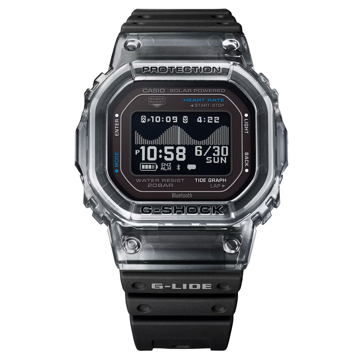 La fusion d'une esthétique prête à surfer et d'un suivi de la condition physique par la G-Squad, ces montres carrées s'inspirent fortement de la populaire G-Squad g-Squad, ces montres carrées s'inspirent fortement de la populaire GBX-100. La GBX-H5600-1 noire et la GBX-H5600-2 bleue présentent toutes deux un design translucide rafraîchissant qui évoque parfaitement l'ambiance des plages d'été. Elles sont dotées d'un écran LCD MIP haute définition et à fort contraste qui facilite la consultation des notifications et des graphiques de marée, même en plein soleil. Les deux appareils sont construits en plastique biomasse écologique et ne pèsent que 47 grammes.