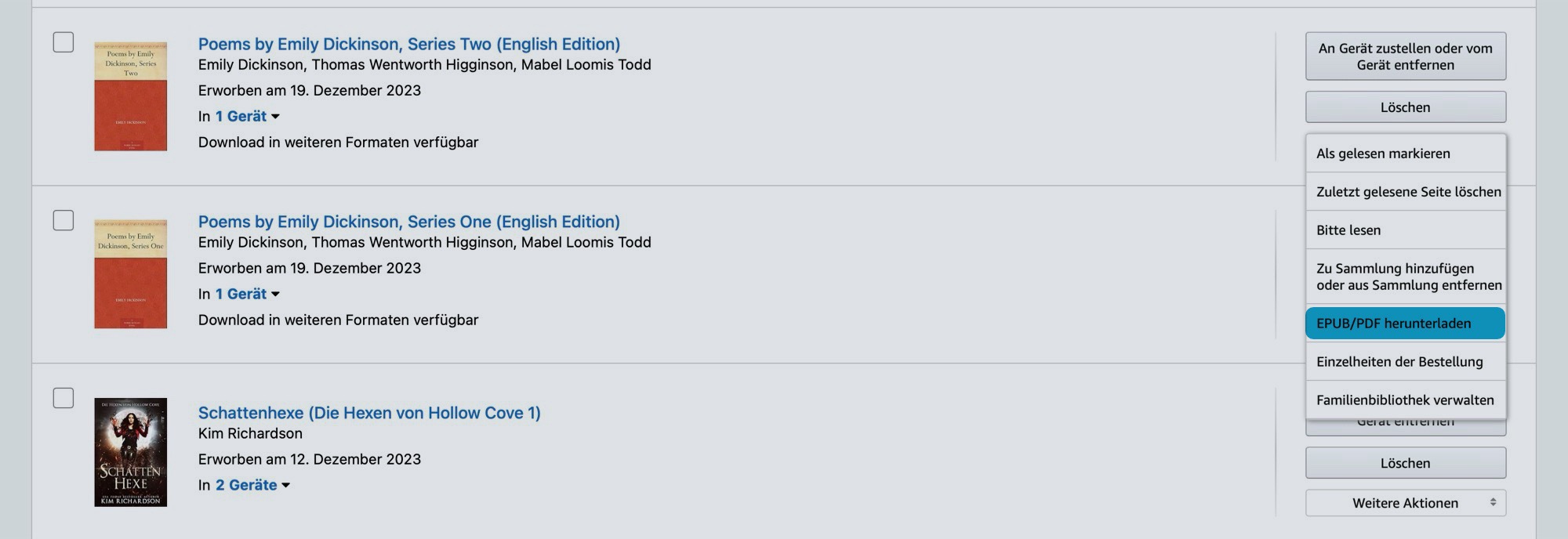 Pour télécharger un livre électronique, sélectionnez-le dans la rubrique "Contenu numérique" de votre compte Amazon. Si une version sans DRM est disponible, l'option "Télécharger EPUB/PDF" apparaît sous "Autres actions". Cela permet de lire le livre sur des lecteurs électroniques sans l'application Kindle. La vente sans DRM signifie également que les livres peuvent théoriquement être partagés avec des amis. C'est pourquoi Amazon donne aux éditeurs la possibilité de proposer leurs livres avec ou sans DRM.