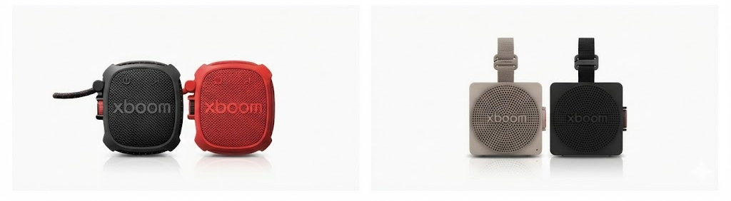 LG a introduit le Xboom Mini, un modèle de plus petite taille. Ce modèle présente un design élégant en forme de "cube" destiné à s'intégrer parfaitement dans le décor de la maison, comme les cuisines ou les terrasses. Malgré sa taille compacte, le Mini offre 10 heures de lecture et utilise la fonction "Sound Field Enhance" pour maintenir la clarté audio dans les espaces ouverts. Il est certifié IP67 pour sa résistance à l'eau et à la poussière et comprend une "sangle magique" et une fixation pour trépied, ce qui le rend suffisamment polyvalent pour être placé sur une étagère à l'intérieur ou suspendu à l'extérieur.