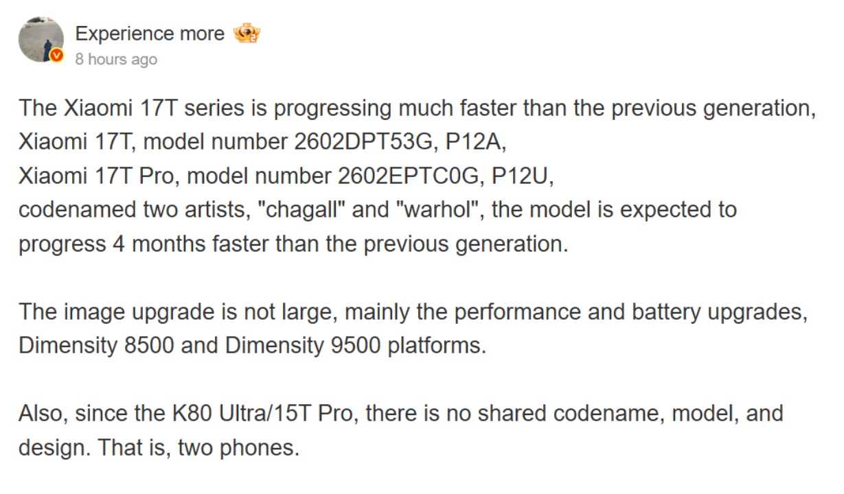 Au contraire, ils affirment que le Xiaomi 17T Pro et le Redmi K90 Ultra sont deux smartphones distincts. Sur Weibo, Experience more estime que le Xiaomi 17T Pro et le Xiaomi 17T ont " quatre mois d'avance sur la génération précédente ". Par conséquent, nous pourrions voir la série Xiaomi 17T faire ses débuts mondiaux entre la mi-mai et la fin mai 2026 plutôt qu'en septembre 2026.