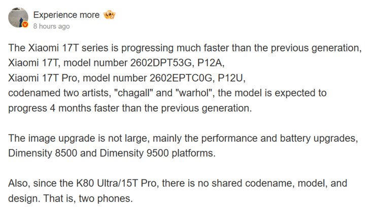 On sait déjà beaucoup de choses sur les prochains smartphones phares de Xiaomi. En bref, de récents changements de code ont révélé de la batterie et de l'appareil photo du Xiaomi 17T. Aujourd'hui, le célèbre leaker Experience more s'est exprimé sur l'état de la série Xiaomi 17T dans son ensemble.
