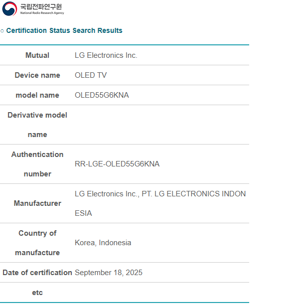 Récemment, DisplaySpecifications a découvert les téléviseurs LG C6 et G6 dans la base de données de National Radio Research Agency (NRRA) en Corée du Sud. La taille de 55 pouces de chaque téléviseur est indiquée comme étant certifiée pour la vente sur ce marché. Ces modèles devraient être proposés dans différentes tailles. À titre indicatif, le 2025 C5 est disponible en 42 pouces, 48 pouces, 55 pouces, 65 pouces, 77 pouces et 83 pouces, tandis que le G5 peut être acheté en 55 pouces, 65 pouces, 77 pouces, 83 pouces ou 97 pouces.