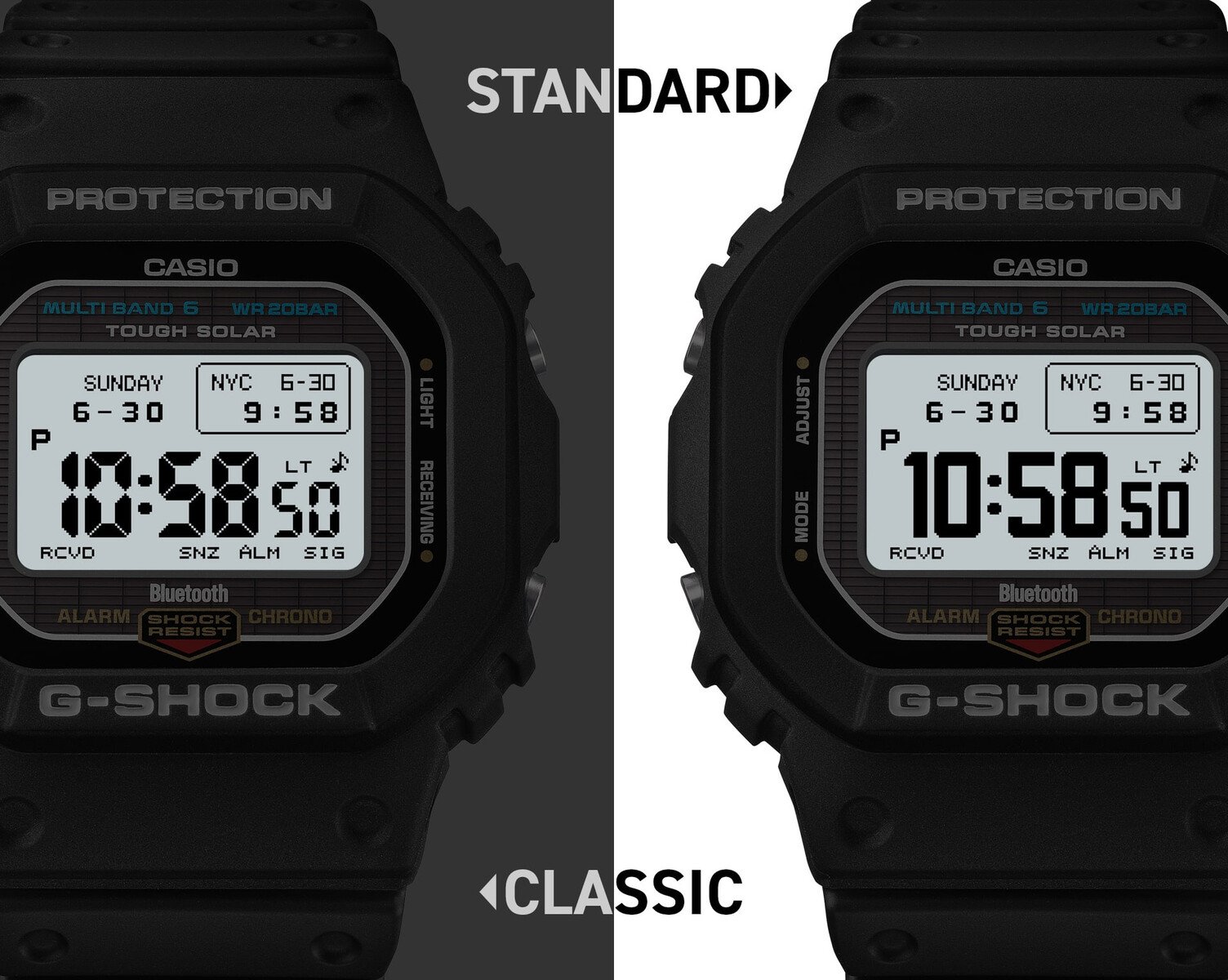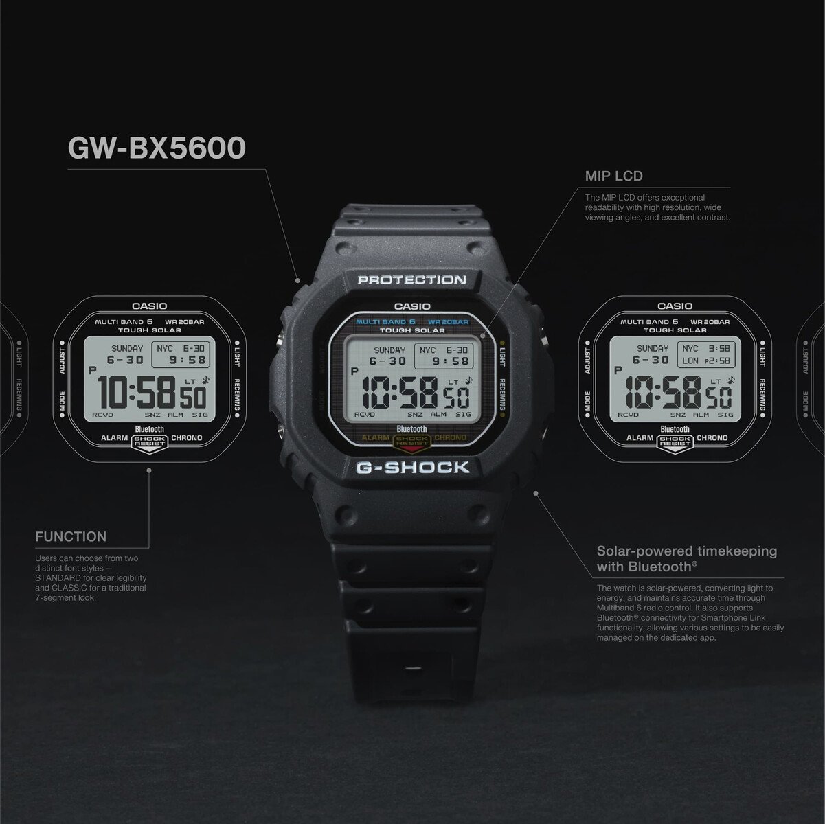Les deux modèles sont dotés du tout dernier écran LCD MIP haute définition de Casio, qui offre une clarté accrue par rapport à l'écran standard DW-5600. La GW-BX5600-1JF reprend le motif de briques caractéristique de G-Shock avec un léger anneau d'accentuation, tandis que la GW-BX5600-1A1JF arbore un look plus discret, entièrement occulté.