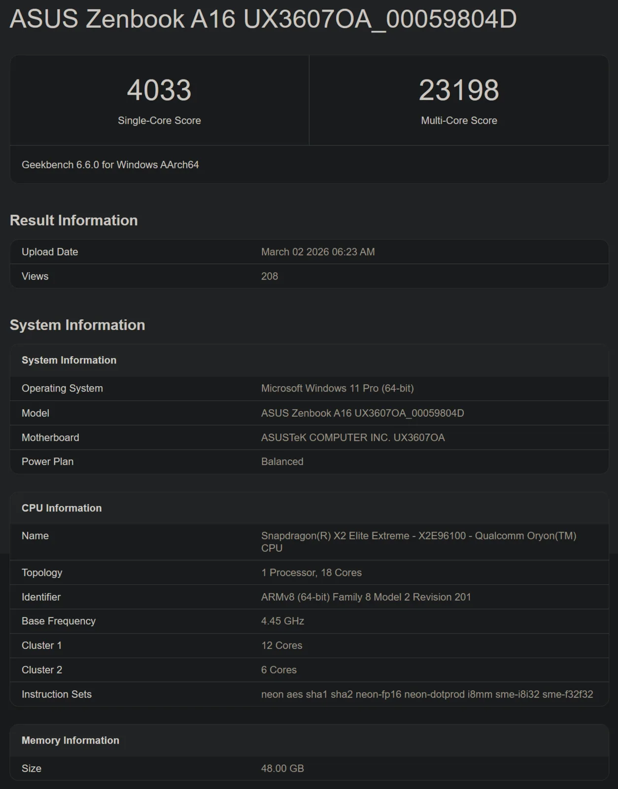Même si Asus , HPet d'autres ont présenté de nombreux ordinateurs portables équipés de Snapdragon X2 Elite au CES 2026, ils n'ont pas encore été commercialisés, du moins sur les marchés mondiaux. Qualcomm a fait de grandes déclarations sur le Snapdragon X2 Elite sur les performances du processeur et du GPU du Snapdragon X2 Elite, mais l'absence d'appareils prêts pour la production les rendait difficiles à vérifier. Aujourd'hui, nous pouvons voir le Snapdragon X2 Elite Extreme X2E-96-100 sur Geekbench.