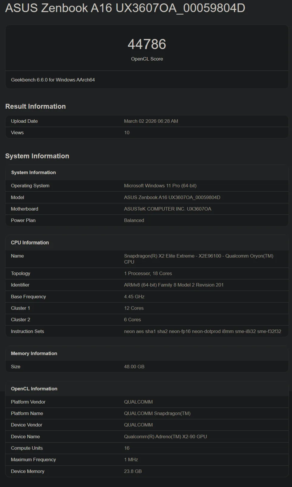 Un second listing nous donne un aperçu des performances GPU du Snapdragon X2 Elite Extreme X2E-96-100. Le GPU Adreno X2-90 obtient 44 786 points dans le benchmark OpenCL de Geekbench ( ). Geekbench indique qu'il dispose de 16 CU, mais ce score n'est pas fiable car sa vitesse d'horloge n'est que de 1 MHz. Néanmoins, il parvient à offrir des performances presque deux fois supérieures à celles de la dernière génération de processeurs Adreno X1-85 De dernière génération, qui n'obtient que 23 854 points dans le même test.