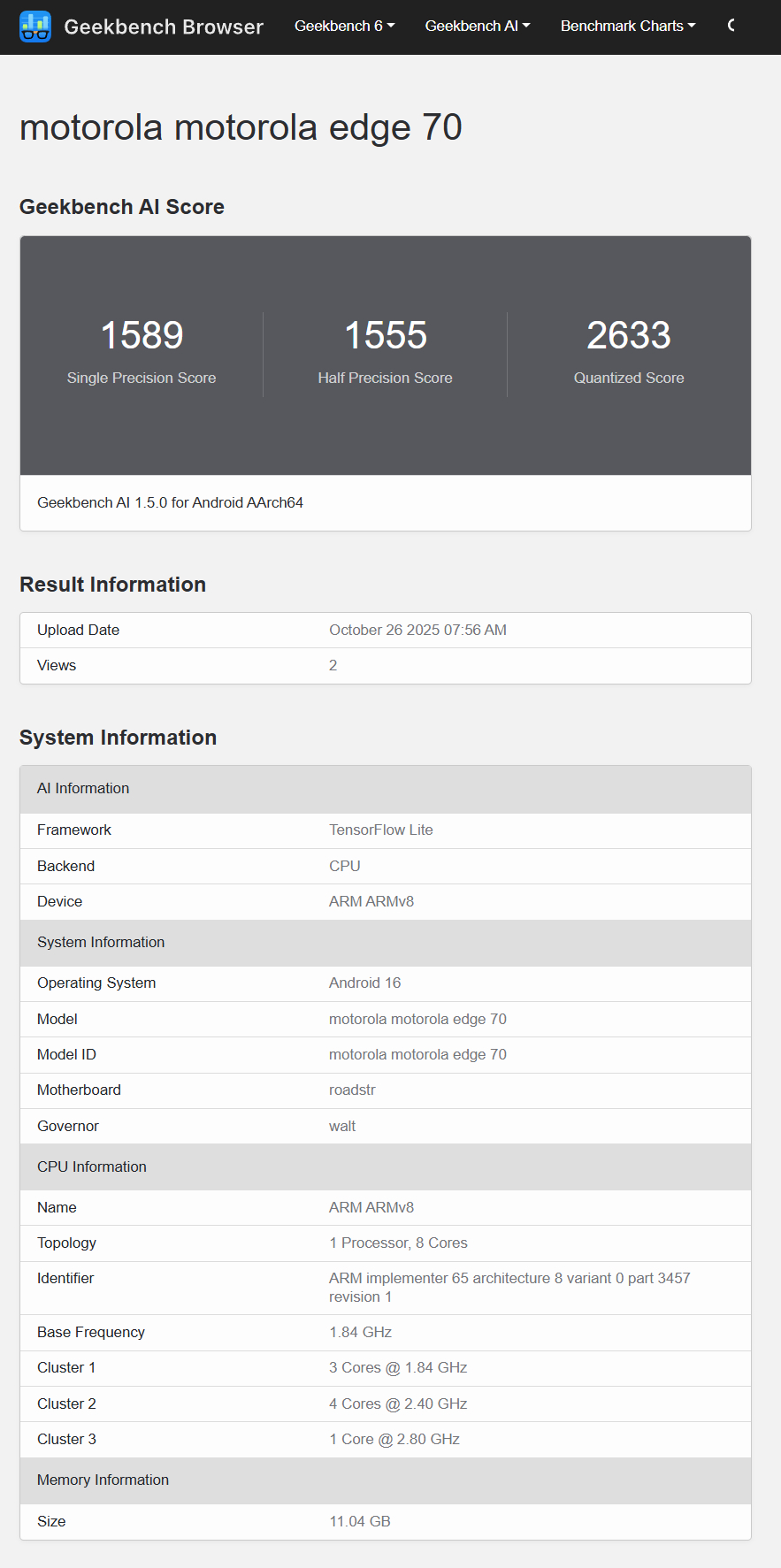 Comme le montre l'image ci-dessous, Motorola a associé ce chipset à 12 Go de mémoire vive et 512 Go d'espace de stockage. Selon les premiers résultats de Geekbench, la combinaison d'un Snapdragon 7 Gen 4 et de 12 Go de RAM permet au Edge 70 d'égaler les performances du CPU du MediaTek Dimensity 8350-de MediaTek Dimensity 8350 Edge 60 Pro qui l'a précédé.