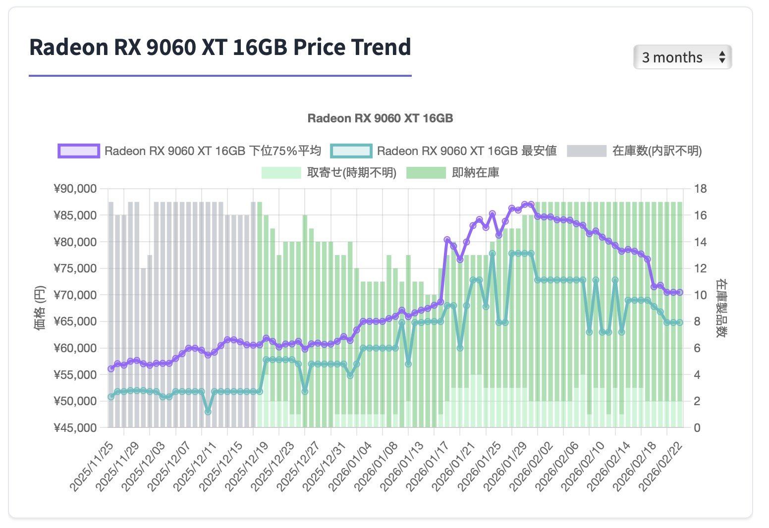 Les hausses de prix du matériel de jeu dues à des contraintes d'approvisionnement et à une demande constante n'ont rien d'exceptionnel, mais c'est le contraire qui semble s'être produit au Japon. Comme le souligne de GAZ:logsuite à la pénurie de cartes GeForce fin 2025, les prix des cartes Radeon 9060 et 9070 sont montés en flèche, atteignant des hausses de 45 % en janvier 2026 par rapport aux prix de décembre 2025 pour le GPU de jeu phare Radeon 9070 XT.