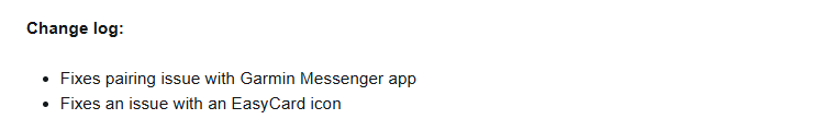 Le journal des modifications de la version bêta 17.02 est identique à celui de la version 17.01. Il mentionne la résolution d'un problème lié à l'appairage pour l'application Garmin Messenger, et indique également qu'un bug lié à l'icône EasyCard a été corrigé. Sur la base de ces notes de version, il n'est pas clair en quoi cette version bêta diffère de son prédécesseur stable.
