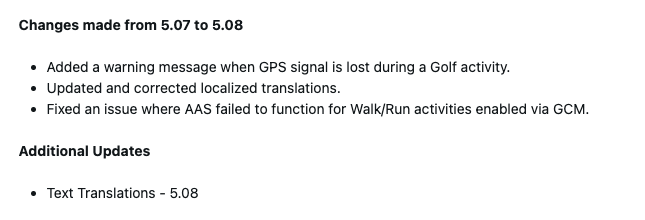 Enfin, Garmin déclare avoir mis à jour et corrigé les traductions localisées. La société indique que la montre fonctionne désormais avec la version 5.08 de Text Translations, mais on ne sait pas quelles langues bénéficient de cette mise à jour.