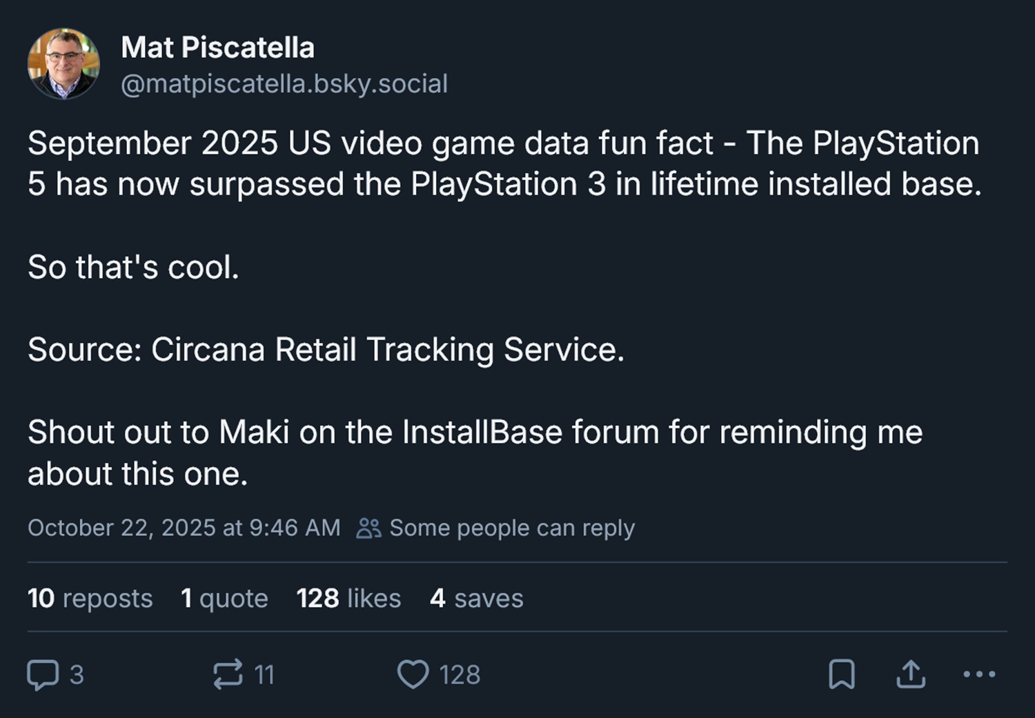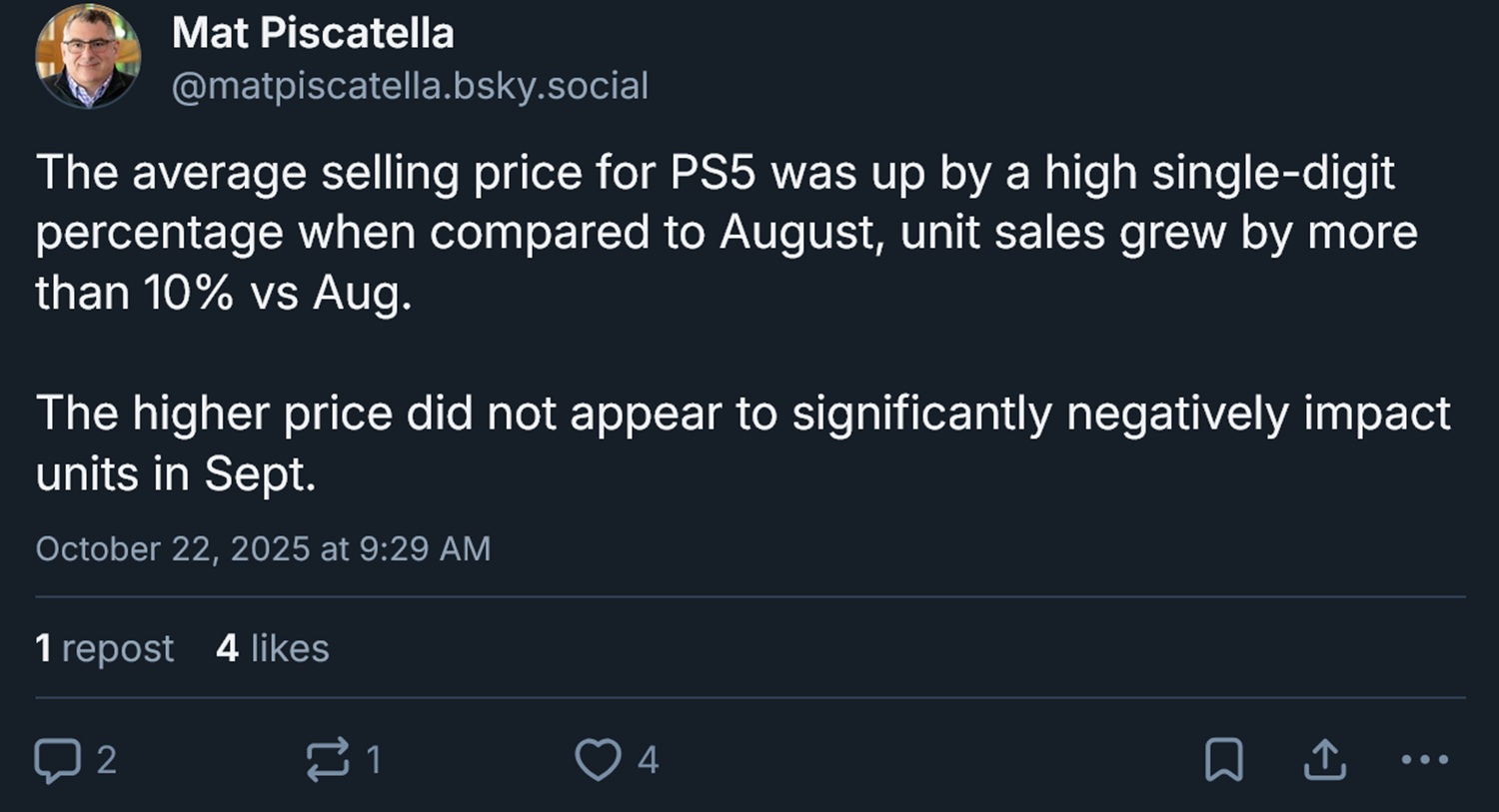 Matt Piscatella a mis à jour le public avec une série de billets sur Bluesky. Il note que par rapport au mois d'août, le "prix de vente moyen de la PS5 a augmenté d'un pourcentage élevé à un chiffre". Malgré les prix de vente moyens plus élevés, les ventes d'unités ont augmenté de plus de 10 % en septembre.