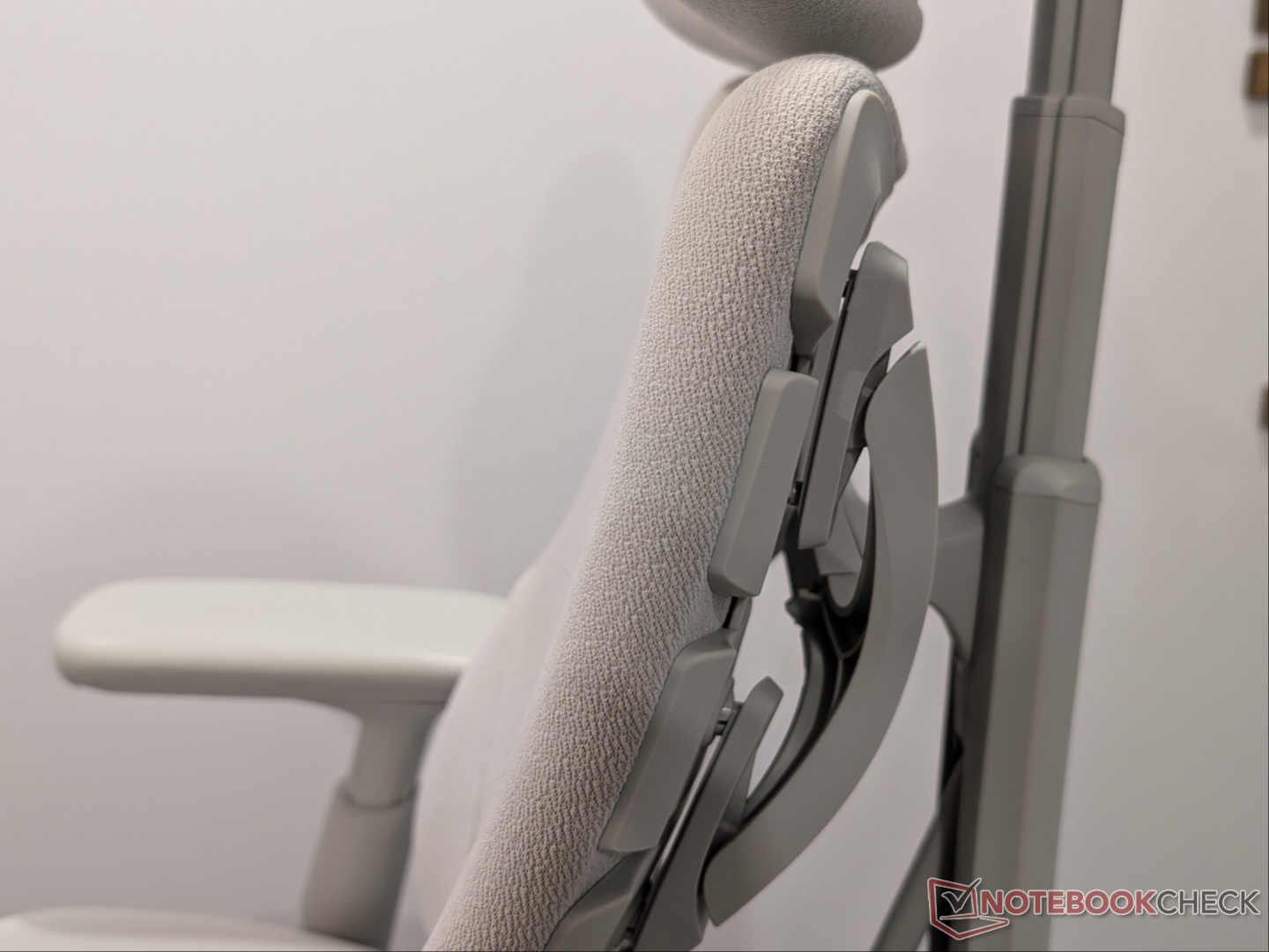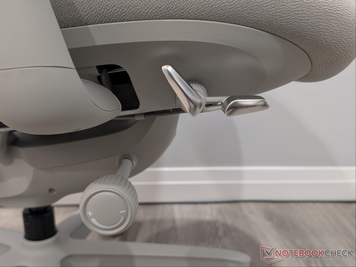 Maintenant, la star du spectacle, le dossier et le soutien lombaire. La base est un "matériau résilient de siège d'avion" recouvert d'une couche d'éponge flexible qui soulage la pression. L'éponge est enveloppée d'une fibre élastique au toucher micro-lin. J'ai trouvé que la densité de la mousse était confortable et soutenante, et que le tissu était doux au toucher. Comme il repose sur une seule colonne vertébrale, le dossier se déplace latéralement avec vous. Les fonctions d'inclinaison standard sont présentes ici, y compris le verrouillage de l'angle d'inclinaison et le réglage de la tension. Il peut être verrouillé à quatre angles - 105, 120, 135 et 160 degrés - et le dossier ne s'incline pas au-delà de l'angle défini, ce qui, à mon avis, est mieux que le verrouillage du dossier à l'angle défini. J'ai lu des commentaires indiquant que la deuxième position était trop reculée, mais cela ne m'a pas gêné, car je l'ai trouvée tout à fait correcte. J'ai tendance à m'incliner au deuxième niveau, à avancer le fauteuil au maximum et à aligner les accoudoirs avec le bureau.