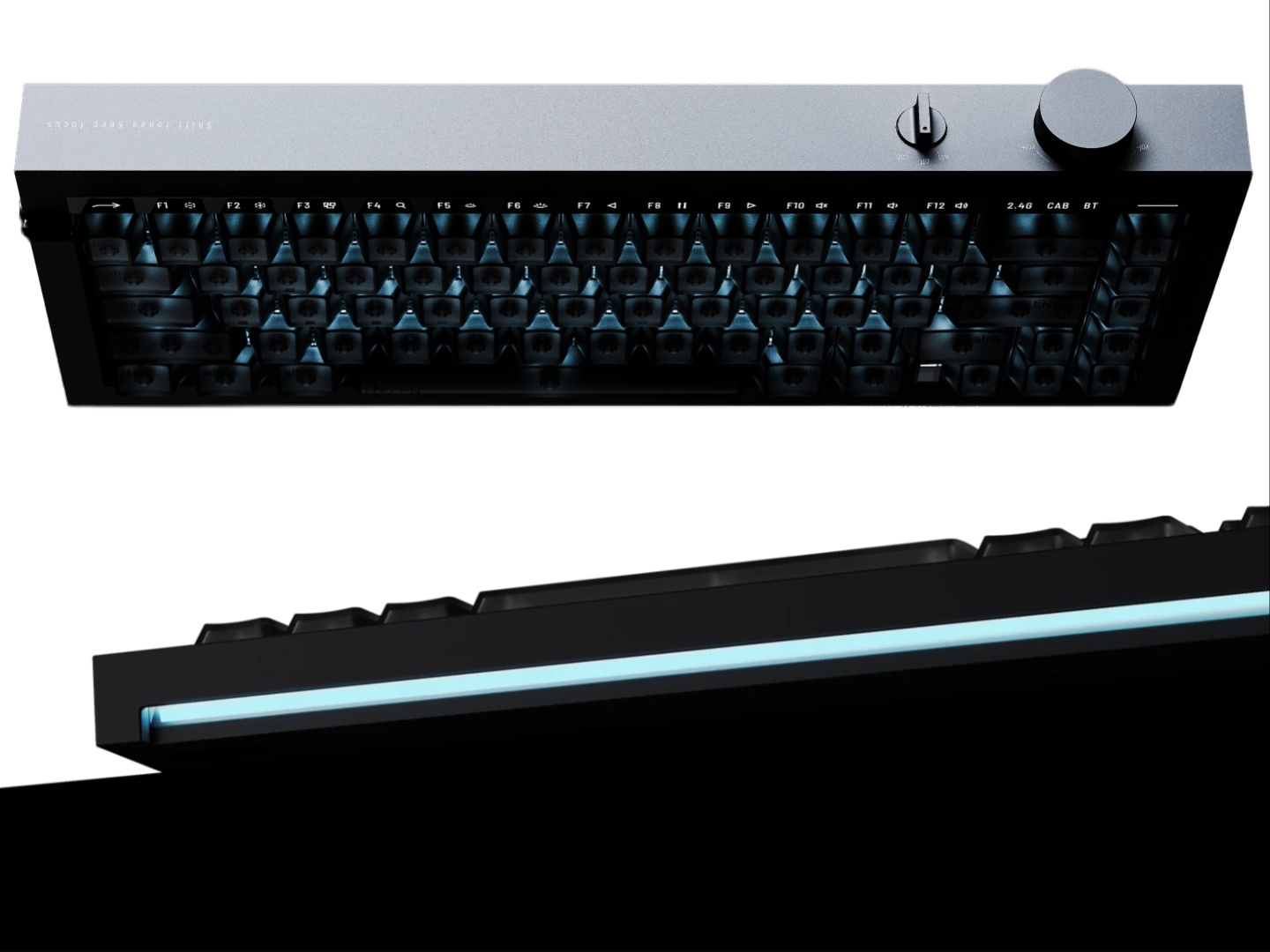 En ce qui concerne le design, le châssis a été usiné CNC à partir d'un seul bloc d'aluminium. Il s'agit d'un clavier à 65 %, mais il intègre intelligemment la rangée de fonctions grâce à une bascule dédiée et à des indicateurs LED. Il y a un bouton pour le contrôle audio et un interrupteur à bascule à trois voies pour l'alimentation, le mode câblé et le mode sans fil. Bien qu'il n'y ait pas de pieds en bas, Lofree a ajouté une inclinaison de 12 degrés pour une position de frappe plus ergonomique. L'Hyzen possède également une barre lumineuse LED vers le bas, orientée vers le bas.