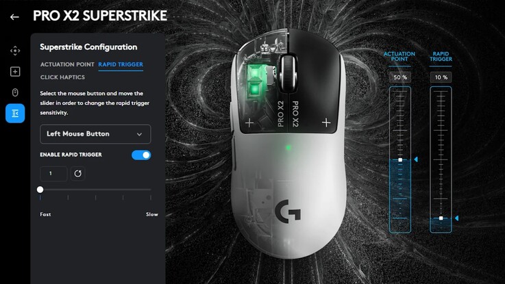 Le retour d'information du clic est simulé par un moteur vibrant, la sensation de clic étant réglable sur six niveaux. Le principal avantage de ce système est que les points d'activation et de réinitialisation peuvent être réglés dans le logiciel d'accompagnement pour s'adapter à vos préférences. Selon Logitech, cela permet de réduire la latence du clic jusqu'à 30 millisecondes. Logitech qualifie ce système de "percée" pour les souris de jeu.