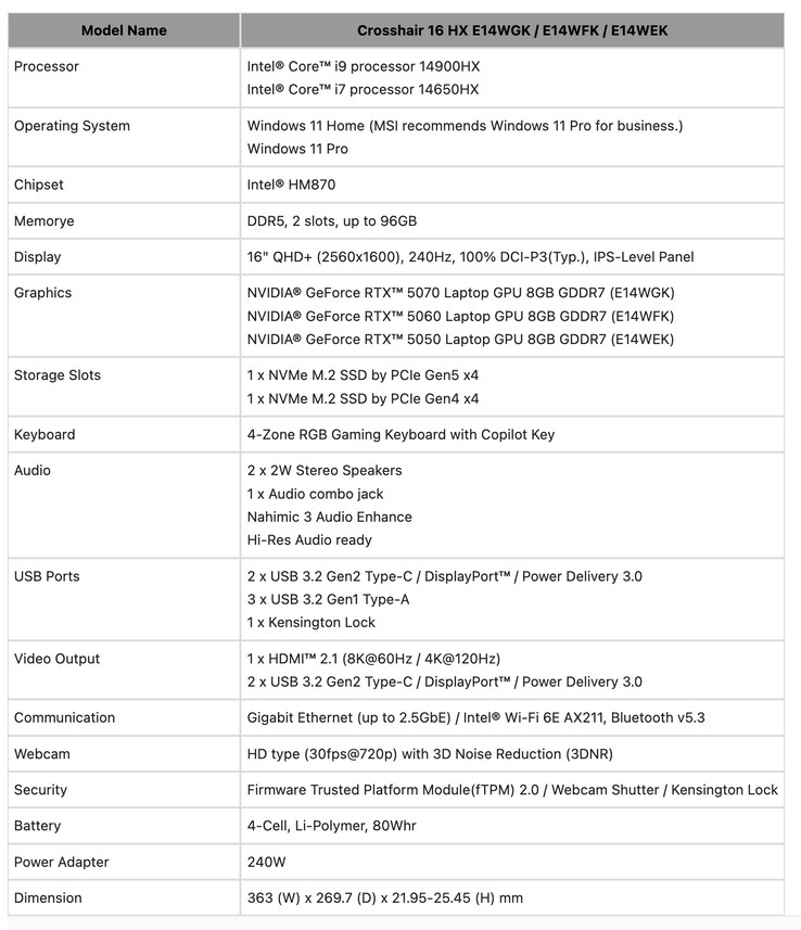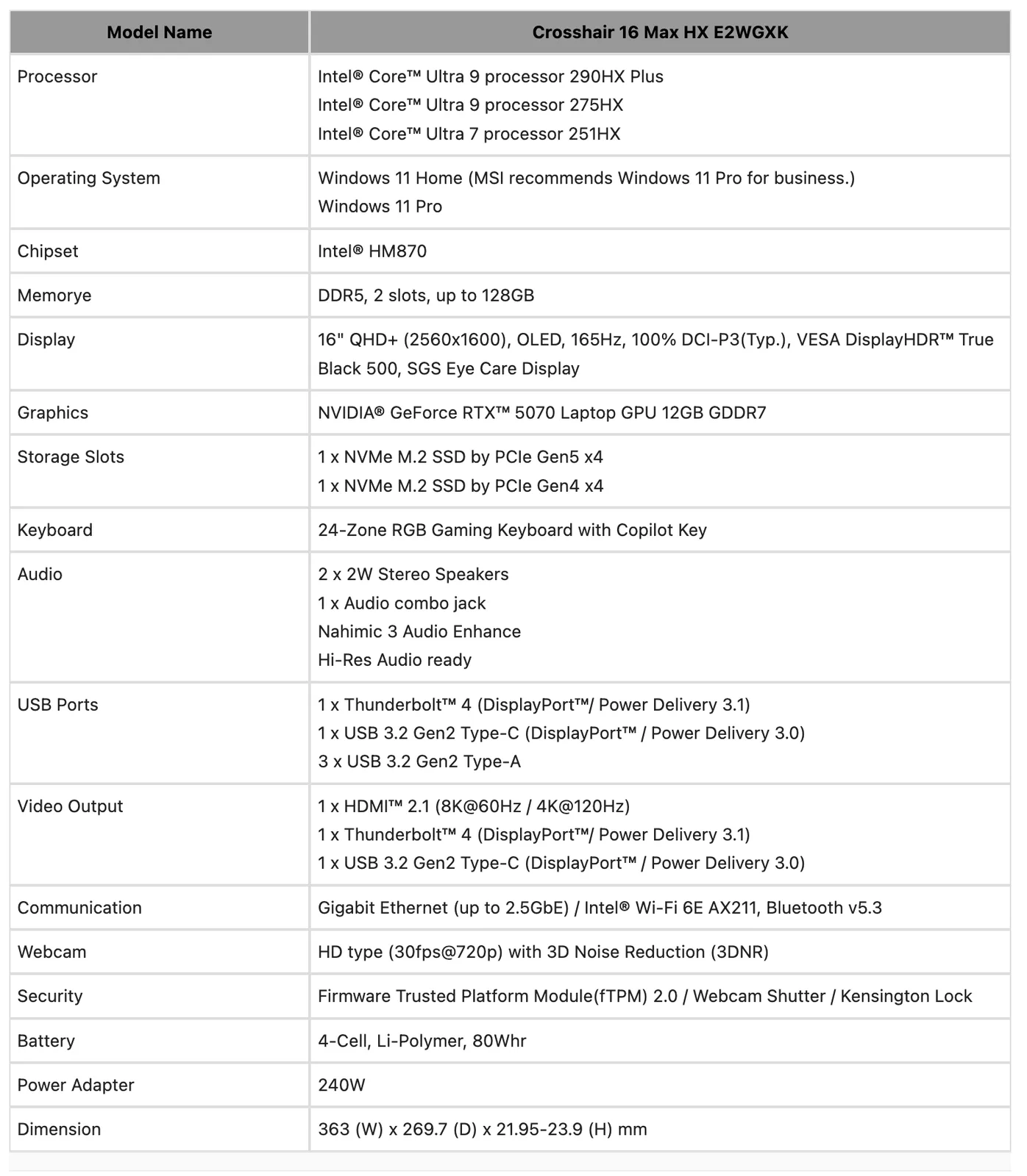 Par ailleurs, le Crosshair 16 Max HX E2WGXK est le premier ordinateur portable dont le lancement a été confirmé avec la technologie Nvidia nvidia de 12 Go RTX 5070 pour ordinateur portable DE NVIDIA DE 12 GO. Par ailleurs, les sept autres ordinateurs portables listés ci-dessus sont équipés soit de la GeForce RTX 5070 Ti, GeForce RTX 5080 ou la GeForce RTX 5090.