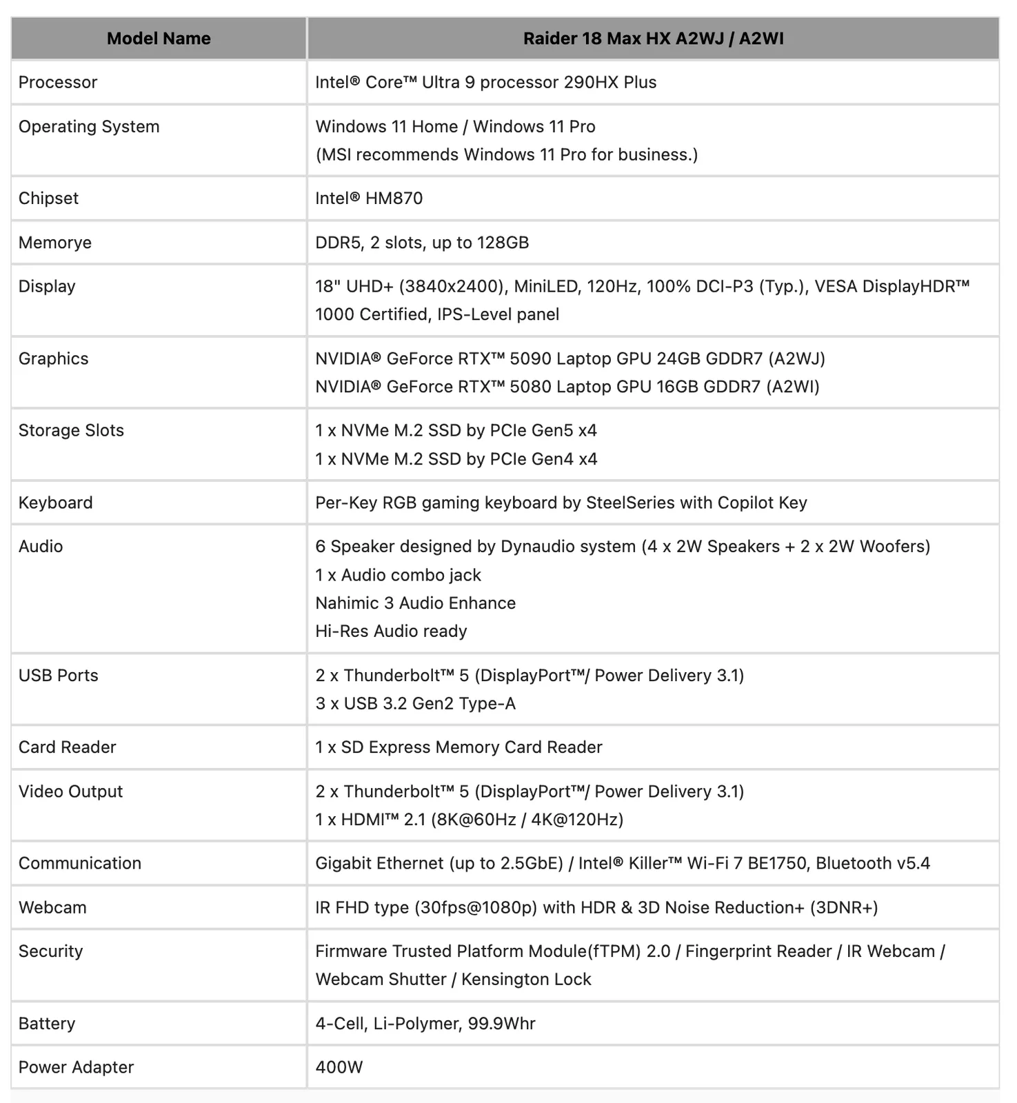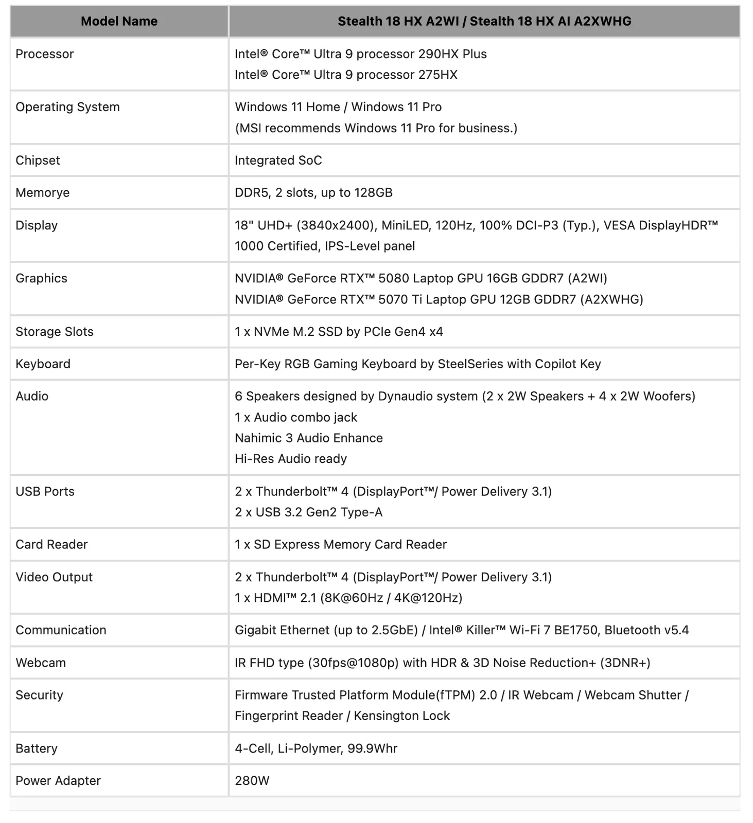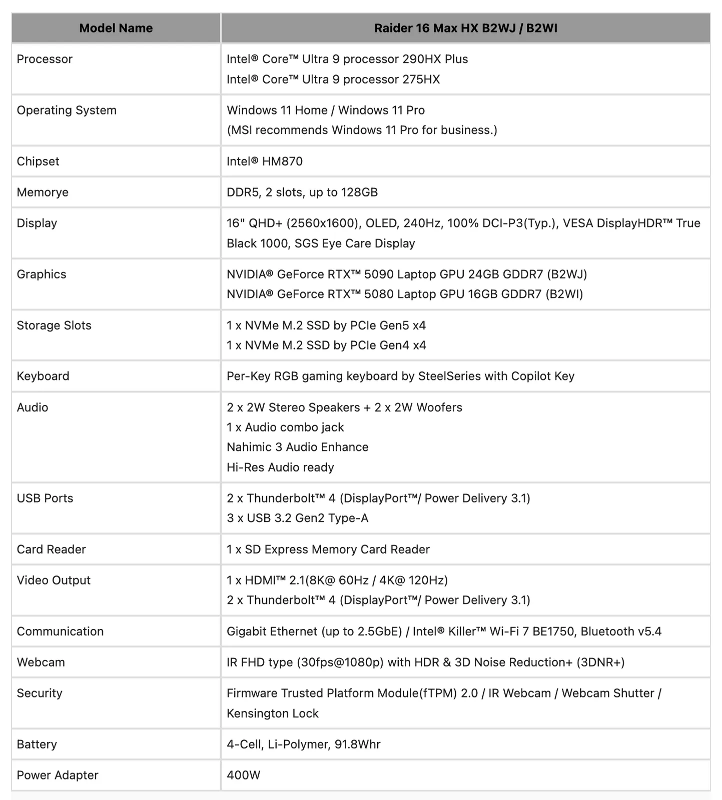 Aujourd'hui, MSI se joint à la fête avec huit nouveaux ordinateurs portables dans ses séries Raider et Stealth Titan. Plus précisément, la société a présenté les ordinateurs portables suivants, équipés de Core Ultra 9 290HX Plus plus :