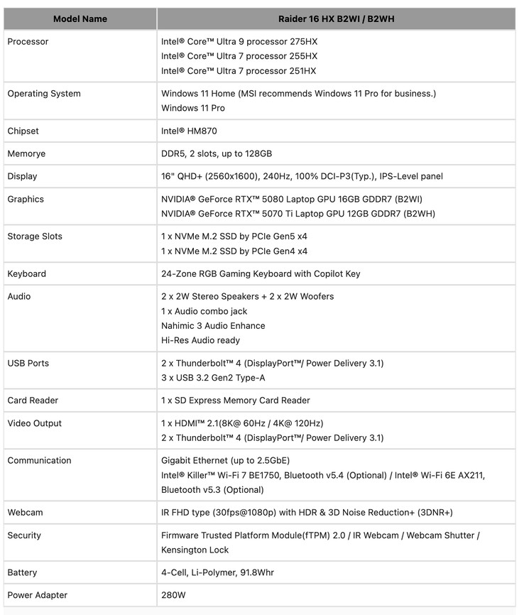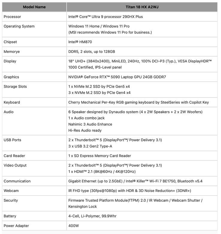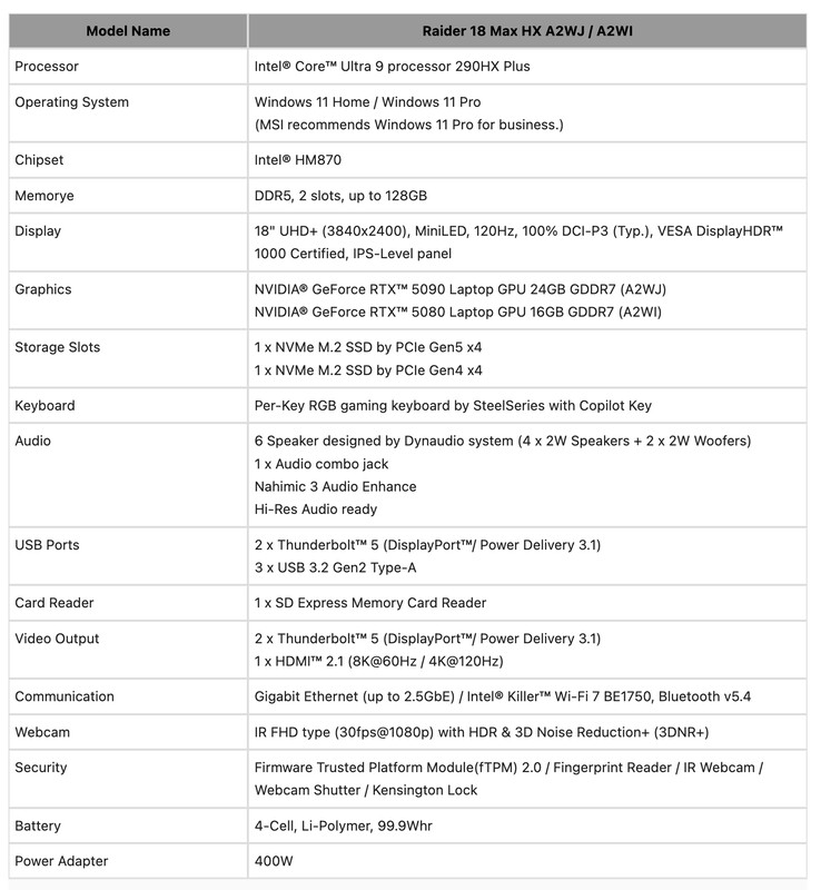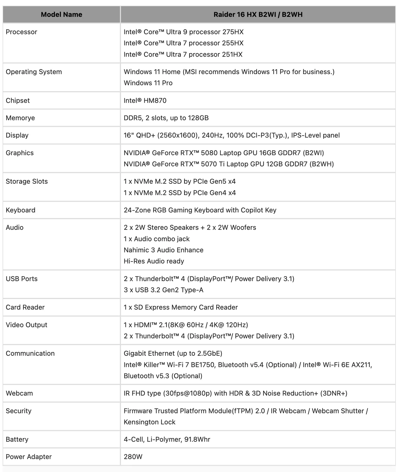 Aujourd'hui, MSI se joint à la fête avec huit nouveaux ordinateurs portables dans ses séries Raider et Stealth Titan. Plus précisément, la société a présenté les ordinateurs portables suivants, équipés de Core Ultra 9 290HX Plus plus :