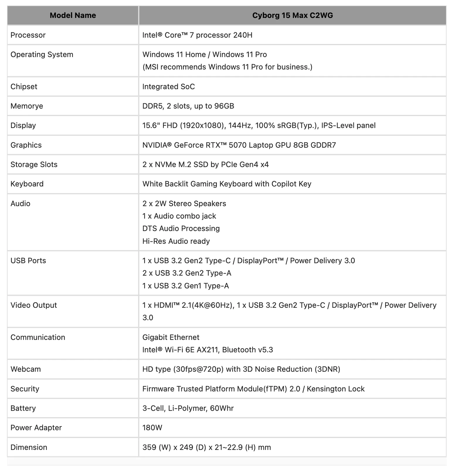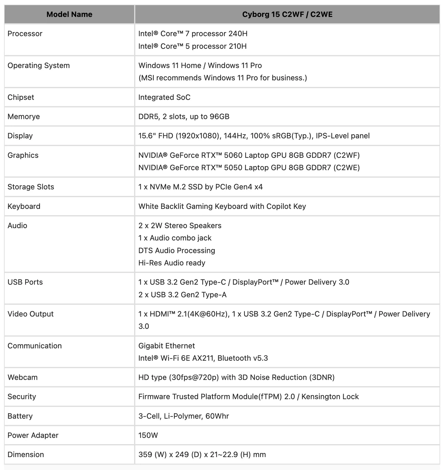 Dans le même temps, MSI a mis à jour la Crosshair 16 HX avec les variantes E14WGK, E14WFK et E14WEK qui tirent parti de la technologie Core i7 14650HX ou Core i9-14900HX et des versions 8 Go de la GeForce RTX 5050, GeForce RTX 5060 ou GeForce RTX 5070. Par ailleurs, MSI a également dévoilé trois nouveaux ordinateurs portables Cyborg de 15 pouces appelés Cyborg 15 Max, C2WG Cyborg 15 C2WF et Cyborg 15 C2WE avec des spécifications similaires à celles des modèles de l'année dernière (actuellement 1 299 $ sur Amazon). MSI n'a pas encore confirmé le prix ou la disponibilité de ses nouveaux modèles. Veuillez consulter le communiqué de presse de la société à l'adresse https://www.msi.com/news/detail/MSI-Unveils-New-Raider-and-Crosshair-Gaming-Laptops-with-Up-to-300W-Combined-Power--Delivering-Industry-leading-Performance--148460 pour plus de détails.