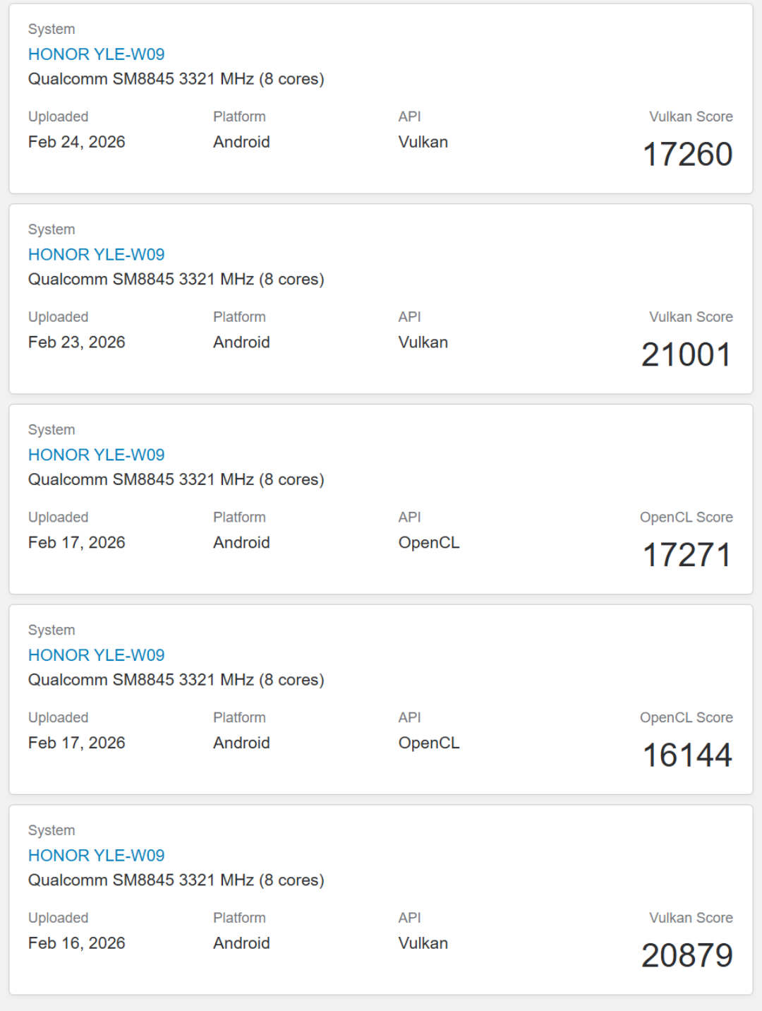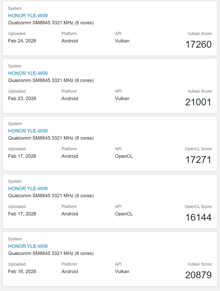 Les performances obtenues avec le GPU Adreno 829 intégré ne sont cependant pas à la hauteur des attentes. Bien qu'il s'agisse d'un ensemble de données limité pour l'instant, tous les scores OpenCL et Vulkan obtenus jusqu'à présent sont inférieurs à ce que nous attendons des chipsets haut de gamme tels que le Dimensity 9400+, Snapdragon 8 Elite ou le Snapdragon 8 Elite Gen 5. Veuillez consulter notre article précédent pour plus de détails sur le MagicPad 4.