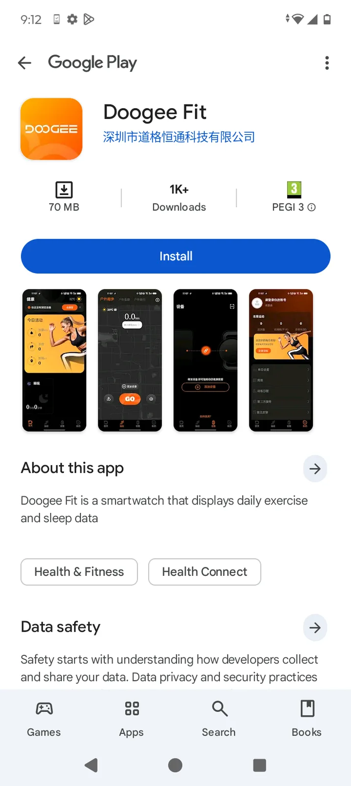 La configuration initiale consiste à scanner un code QR avec un smartphone. L'utilisateur est alors dirigé vers une page d'apparence simple contenant deux liens vers la boutique d'applications, l'un pour iOS et l'autre pour Android. Un téléphone Motorola abordable fonctionnant sous Android 14 a été utilisé pour effectuer les tests ; l'application Doogee Fit fonctionne parfaitement sur ce téléphone. Veuillez noter que l'application nécessite de nombreuses autorisations pour que la plupart de ses fonctions fonctionnent correctement.
