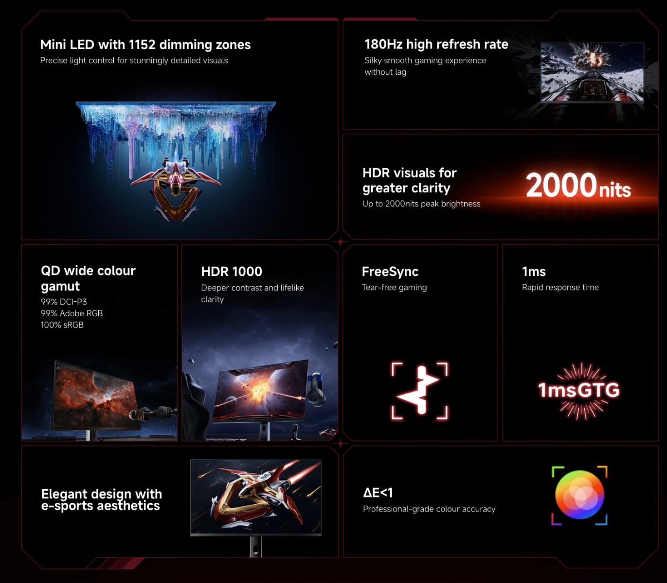 L'entreprise affirme également que 1 152 zones de gradation locale permettent au Mini LED Gaming Monitor G Pro 27Qi 2026 d'atteindre jusqu'à 2 000 nits de luminosité maximale tout en maintenant une couverture de 99 % des espaces colorimétriques Adobe RGB et DCI-P3. Veuillez noter que cette valeur de luminosité maximale ne sera vraie que sur de petites zones lorsque le mode HDR est activé. Malheureusement, Xiaomi n'a pas donné plus de détails à ce sujet. Le prix reste inconnu pour l'instant, bien que le Mini LED Gaming Monitor G Pro 27i ait été lancé en septembre dernier avec un prix de vente conseillé de 329,99 $. Vous trouverez plus de détails sur le Mini LED Gaming Monitor G Pro 27Qi 2026 à l'adresse sur le site web de Xiaomi.