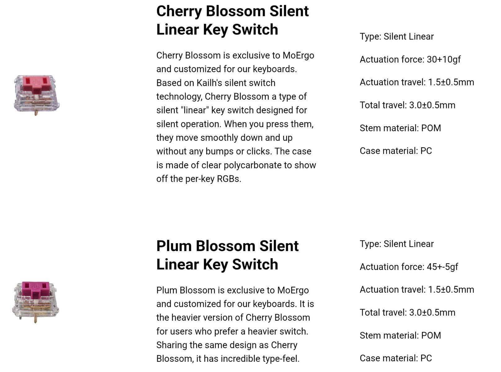 Pour commencer, le nouveau clavier est équipé de commutateurs Kailh Choc V1 remplaçables à chaud, mais cette fois-ci, il est livré avec des commutateurs Cherry Blossom silencieux, qui sont une exclusivité de MoErgo et du Go60 en particulier. Tout comme le Glove80 original, le Go60 possède des touches en POM, ce qui lui confère une sensation de qualité supérieure et une meilleure résistance aux produits chimiques par rapport à des matériaux tels que l'ABS ou même le PBT.