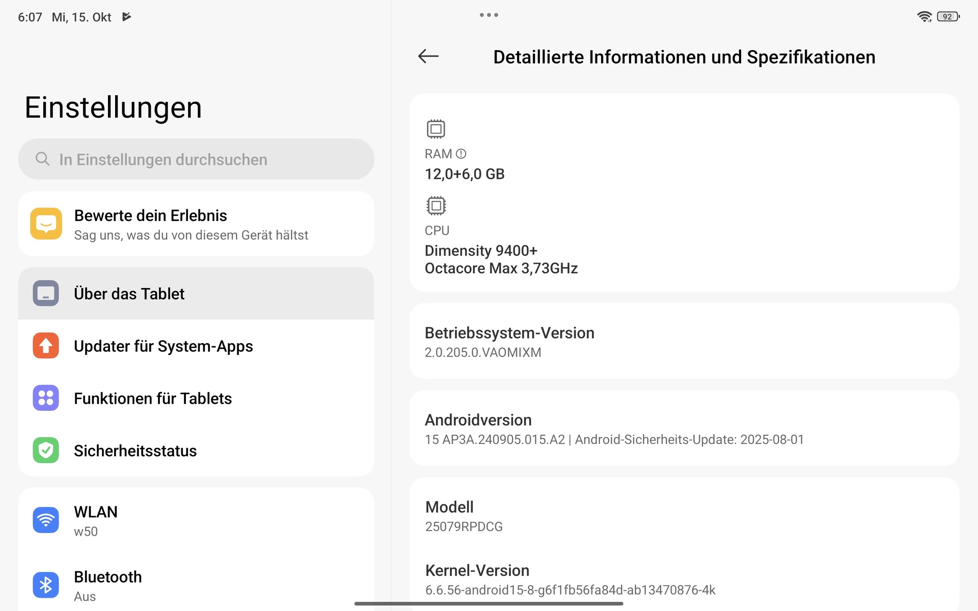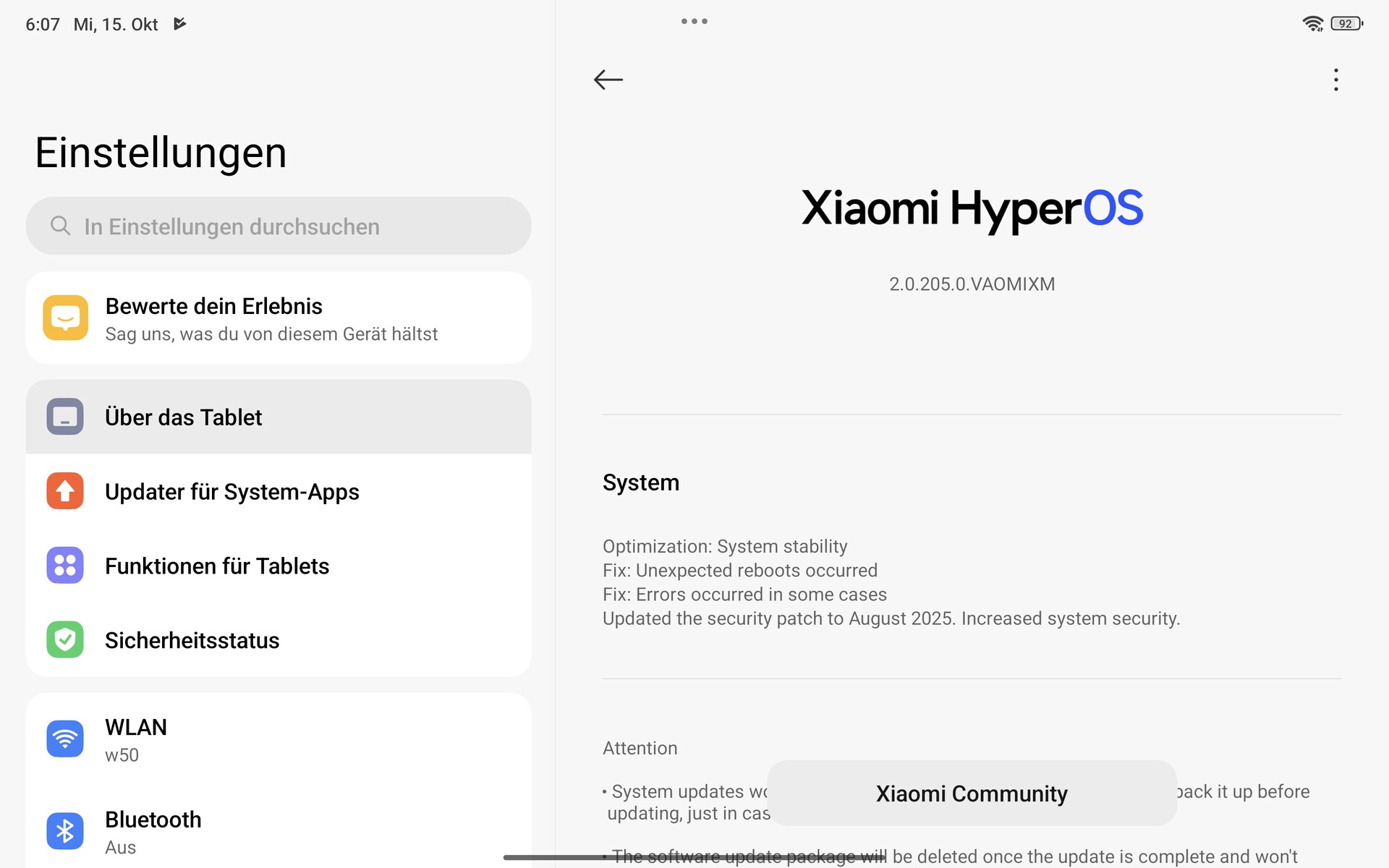 Le Xiaomi Pad Mini fonctionne sous Android 15 avec l'interface utilisateur HyperOS 2.0 de Xiaomi. Selon Xiaomi Trust Centerle Pad Mini recevra des mises à jour de son système d'exploitation jusqu'à Android 17. Il recevra également des mises à jour de sécurité pendant 3 ans, jusqu'en septembre 2028. Ces dernières seront publiées tous les trois mois. Au moment du test à la mi-octobre, la tablette utilisait les correctifs de sécurité Android du mois d'août, qui sont donc à jour.