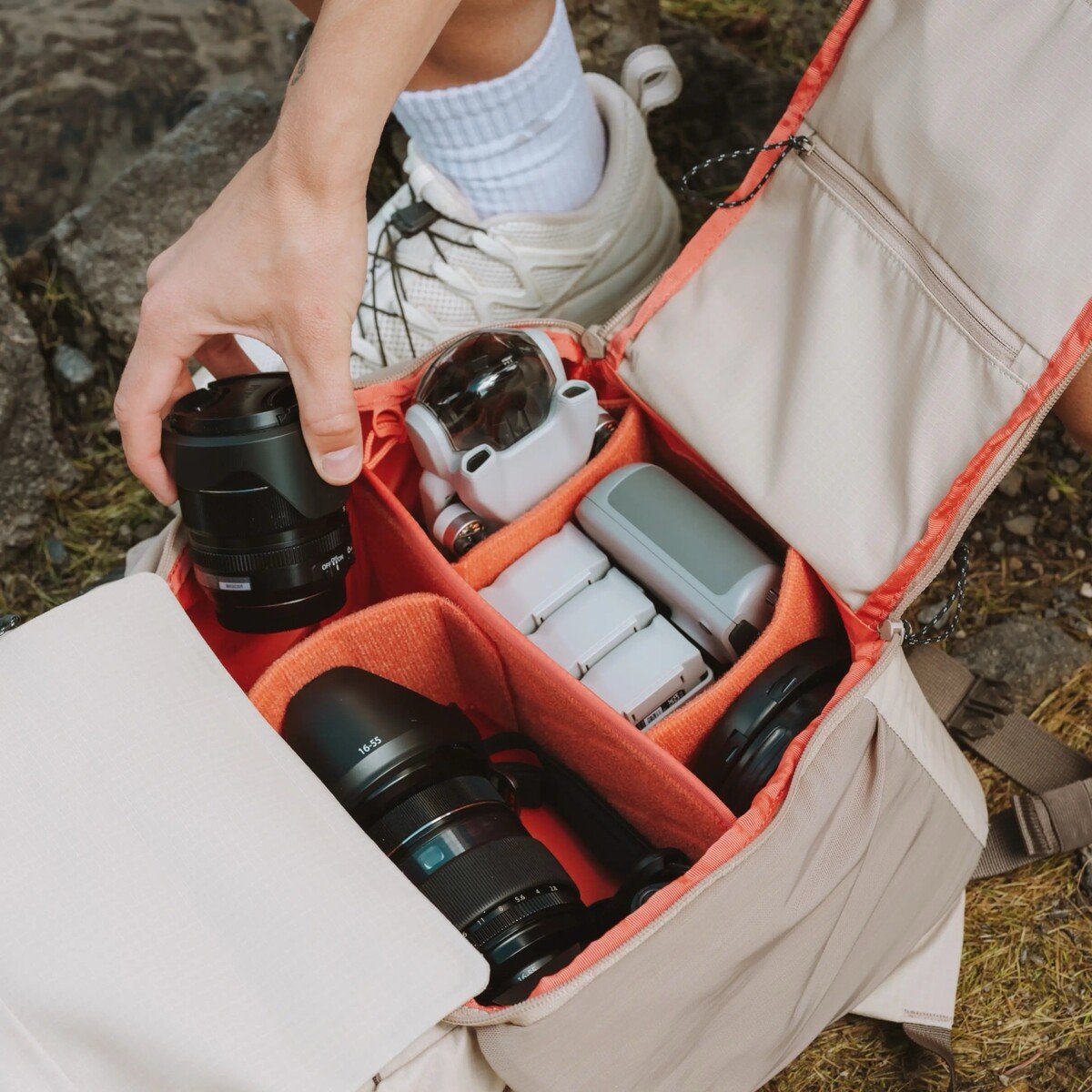 À première vue, le nouveau sac à dos Moment Sequence 23L ressemble à un sac à dos ordinaire, mais il comporte des compartiments rembourrés avec des séparateurs réglables fixés par Velcro, qui offrent de l'espace pour différents appareils photo et objectifs.