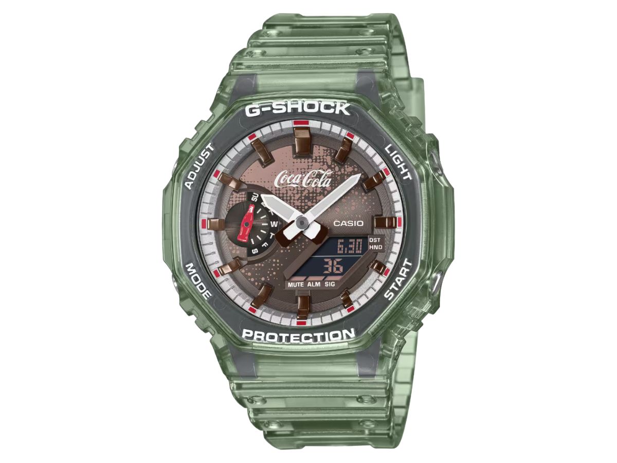 Comme le montrent les images qui ont fuité, la Casio G-Shock GA-2100CC-3A est dotée d'un boîtier et d'un bracelet en résine verte translucide, inspirés de la bouteille en verre de Coca-Cola. Le tout entoure un cadran marron, avec un motif de bulles imitant la boisson, et des accents rouges correspondant à la marque Coca-Cola. De plus, une bouteille remplace l'aiguille standard de l'indicateur du jour de la semaine.