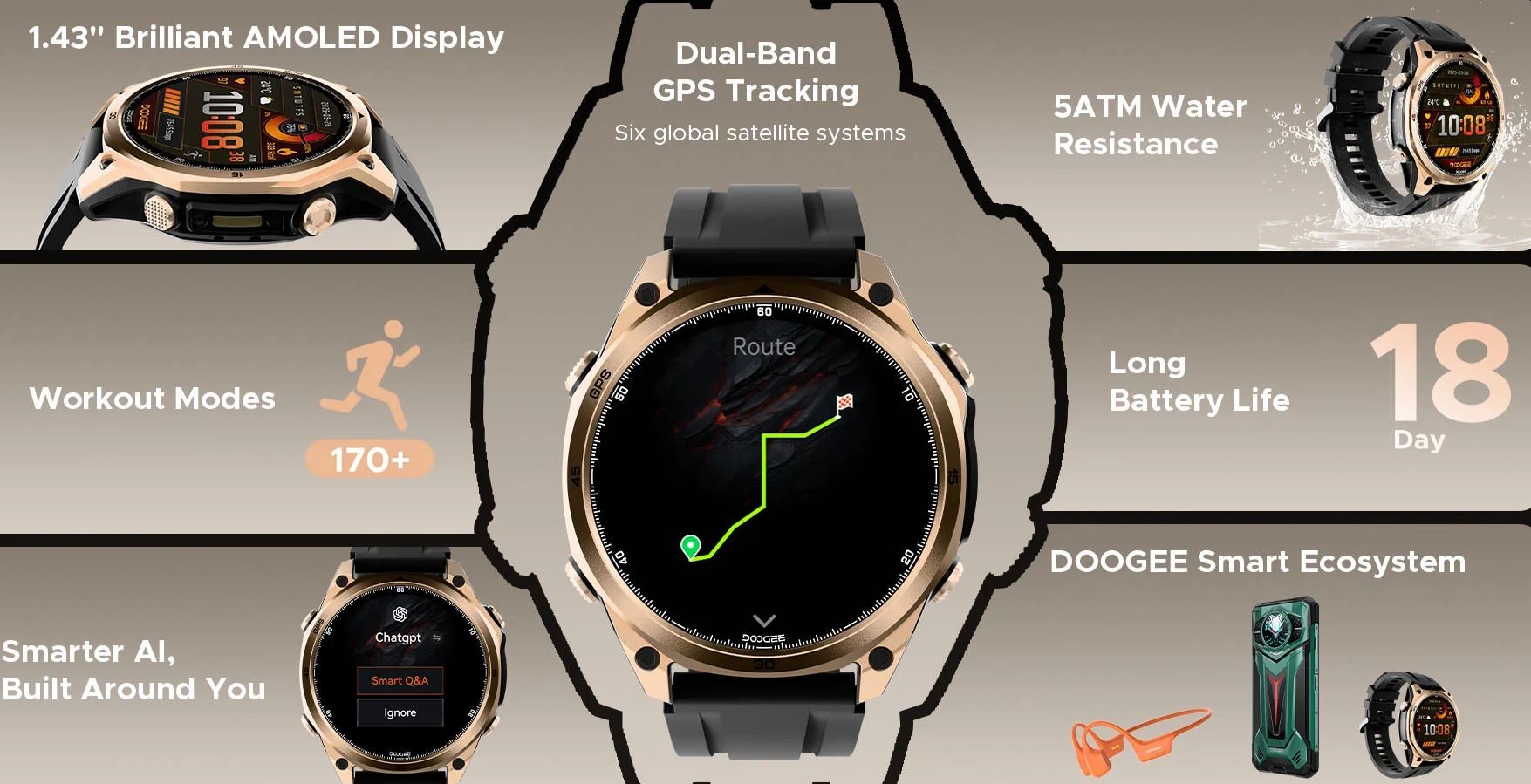 La montre est dotée d'un écran AMOLED de 1,43 pouce et mesure 13,7 millimètres d'épaisseur. Avec ses vis et ses boutons visibles, la smartwatch rappelle les smartwatches Fenix de Garmin et dispose également d'une LED