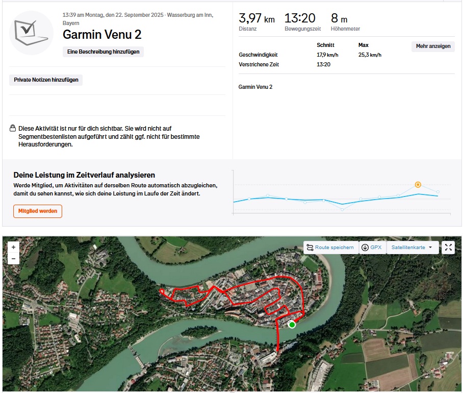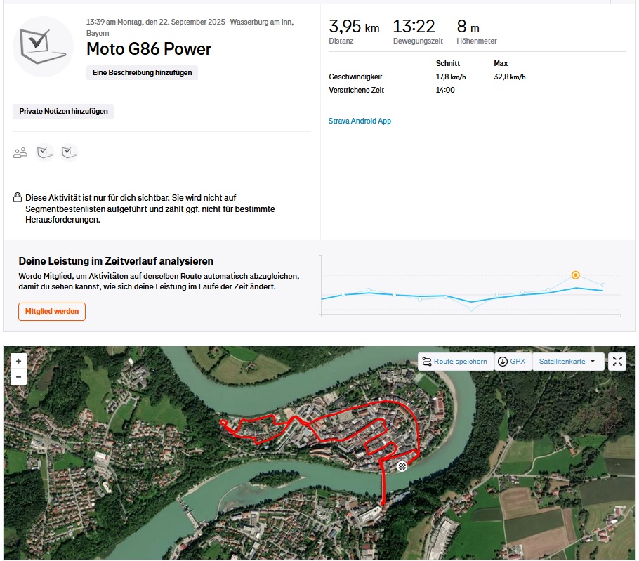 En extérieur, le Moto G86 Power fixe rapidement sa position à environ trois mètres près. Lors de notre test à vélo, la précision de la localisation était parfois un peu faible, mais le smartphone reste suffisamment précis pour une navigation quotidienne.