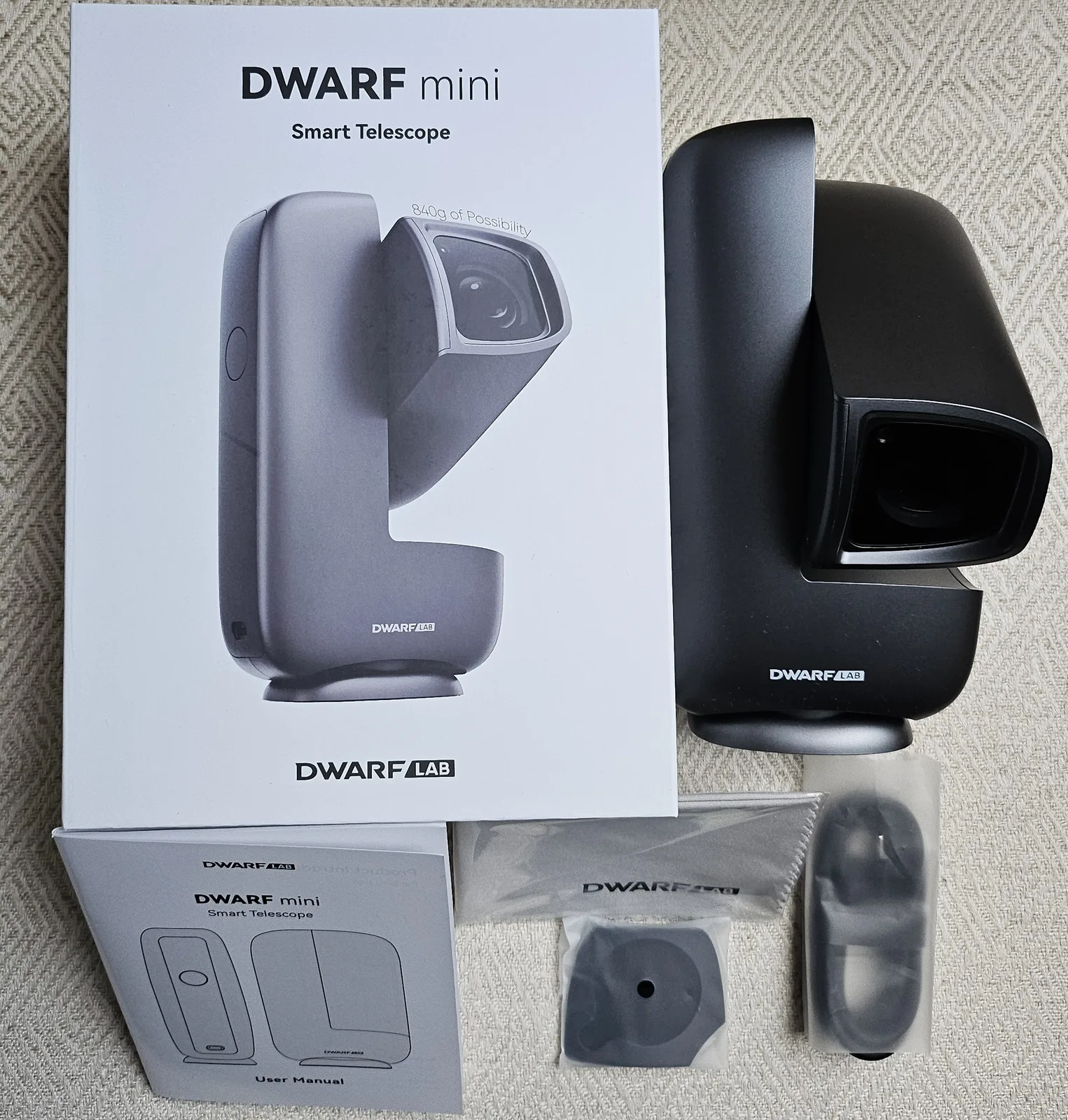 L'emballage très attrayant contient le télescope, un câble USB-C à USB-C pour charger la batterie interne, un filtre de protection solaire à fixation magnétique, un chiffon de nettoyage et un guide de démarrage rapide en six langues.