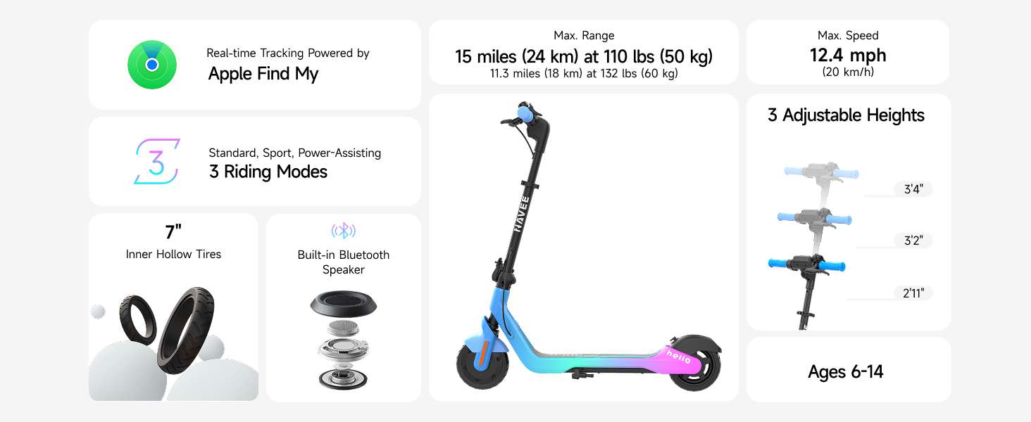 Certains éléments sont communs aux trois modèles, notamment l'éclairage ambiant RVB, un écran LED de 4 pouces, des pneus creux intérieurs de 7 pouces, un système de freinage à tambour arrière et des commandes basées sur l'application pour affiner les réglages de l'e-scooter. Cependant, les trois modèles ont des capacités de charge utile différentes. Par exemple, la variante de base et la variante intermédiaire ont une capacité de charge utile maximale de 110 livres (49,8 kg), tandis que le modèle Max supporte 132 livres (59,8 kg).