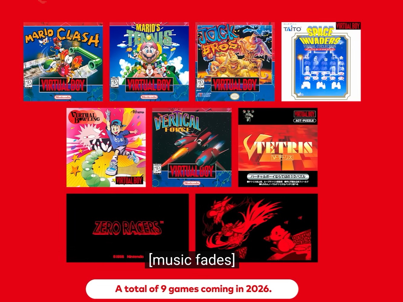 Parmi les autres jeux qui, selon Nintendo, seront ajoutés plus tard dans l'année, citons Mario Clash, Mario Tennis, Jack Bros, Space Invaders Virtual Collection, Virtual Bowling, Vertical Force et V-Tetris. Nintendo sortira également des titres supplémentaires qui n'avaient pas été publiés à l'origine lors du lancement du Virtual Boy en 1995. Il s'agit de Zero Racers et de D-Hopper, qui sortiront également cette année.